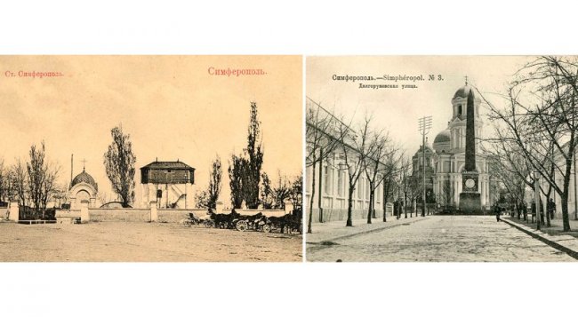 В начале прошлого века неподалёку от привокзальной часовни была стоянка (она существовала и в советские годы, когда на площади был бетонный памятник Иосифу Сталину). Теперь место не изменилось, только вместо дореволюционных пролёток и гужевых повозок (и вместо советских машин «с шашечками») всё больше иномарки. Но, «прогуливаясь» во времени, автомобили пропустим. И вместительные маршрутки тоже - не было такого в юности Симферополя XIX века. Сейчас бы услышать цокот копыт и прокатиться в пролётке по мощёным брусчаткой улочкам… Или хоть вскочить на подножку призывно звенящего трамвая - ему через месяц 109 лет. Но троллейбус тоже подойдёт. Правда, сейчас они современные, способные даже без контактной сети ездить, зато тоже история - 65 лет в следующем году. По «Дороге на Перекоп» подъезжаем в исторический центр. Долгоруковский обелиск, Александро-Невский собор. А из середины прошлого века - памятник-танк, который ровно 79 лет назад установили на братской могиле (на месте возрождённого ныне собора) погибших бойцов 19-го танкового Перекопского Краснознамённого корпуса Ивана Васильева (после его ранения - Ивана Поцелуева). Вокруг одиночные захоронения офицеров разных частей, казнённых фашистами подпольщиков театральной группы «Сокол». И «Белый дом», особо «отличившийся» в 2014-м.