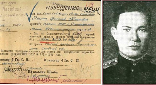 Давно сравнялся с землёй холмик, насыпанный боевыми товарищами, похоронившими пулемётчика «у рыбного промысла» неподалёку от села. И грамоту о том, что симферопольцу Николаю Розенко Указом Президиума Верховного Совета СССР от 16 октября 1943 года присвоено звание Героя Советского Союза (посмертно), передавать было некому. 7 мая 1944-го новый командир полка гвардии подполковник Василий Жмаев и начштаба гвардии майор Павел Иванюшин направили в Симферополь страшную весть для мамы нашего земляка, Марии Яковлевны, по довоенному адресу семьи - улица Севастопольской, 24. «Ваш сын Герой Советского Союза гвардии младший сержант Розенко Николай Петрович в боях за социалистическую родину, верный воинской присяге, проявив геройство и мужество, был убит 25 сентября 1943 года. Похоронен - Рыбный промысел Чернобыльского района Киевской области». Но не нашёл почтальон адресата, и сотрудники горвоенкомиссариата безуспешно искали несколько месяцев, в конце октября отправили извещение обратно в Москву, с припиской - «Родственники в пределах Крыма не проживают». Очевидно, Мария Яковлевна погибла в годы фашистской оккупации полуострова…