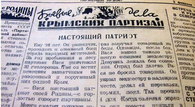 Рассказ о 16-летнем партизане Василии и спасённой им медсестре наша газета опубликовала 3 февраля 1943-го. Фото автора. «Крым - край партизанской славы» - эти слова на стеле встречают приезжающих на полуостров, а на Южный берег люди едут мимо сразу двух памятных знаков народным мстителям - на местах былых боёв… И в Симферополе - памятник партизанам и подпольщикам, и в иных крымских городах и сёлах есть места памяти односельчан-героев, часто совсем юных ребят, отдавших жизни за Родину. Впрочем, тогда, восемьдесят с лишним лет назад они, мужчины и женщины, юноши и девушки, мальчики и девочки, что в период фашистской оккупации боролись здесь с врагом, не делились ни по возрасту, ни по национальности, никак - у всех одна цель, спасти родную землю, победить. Они все понимали, что узнать о том многим не доведётся, но не страшились этого, гибели не страшились, Родина важнее личного - здесь, в оккупации, их фронт, их труд и борьба. Так думали не только крымчане, народные мстители, в этом были уверены партизаны и подпольщики во всех временно оккупированных фашистами регионах Советского Союза. Памятью им всем стало освобождение страны, Победа, а награда, зачастую и невручённая, - медаль «Партизану Отечественной войны». Помня имена Медалью, появившейся в феврале 1943-го по рисунку Николая Москалёва, награждали партизан, их командиров, организаторов партизанского движения «за отвагу, геройство и выдающиеся успехи в партизанской борьбе за советскую Родину в тылу немецко-фашистских захватчиков». Но по факту медаль заслужил и весь наш полуостров, все народные мстители, даже уже, увы, погибшие к моменту её появления. Жизнью, подвигом, верой, борьбой заслужили. И наша газета гордится, что хоть и нет официально среди редакционных наград этой медали, но она всё равно и наша, всего «Красного Крыма», бахчисарайского отрядного «Крымского партизана», ялтинской подпольно-партизанской «Крымской правды», бригадного Северного соединения «За Советский Крым». Мы помним и гордимся, что наши коллеги сражались в Крыму в подполье, в партизанских отрядах: погибшие Исай Блох, Иван Сухиненко, Георгий Кокушинский, Ефим Певзнер, Александр Стогний; узнавшие о Победе и точно награждённые этой медалью - Евгений Степанов (редактор), Сергей Лаганбашев, Эммануил Грабовецкий. Андрей Казанцев, Михаил Сохань… А ещё, перелистывая архивные страницы газеты, узнаём, как сражались и погибали крымские партизаны - о подпольщиках, остававшихся в населённых пунктах в период оккупации полуострова, не писали в газетах - из соображений безопасности. По этим же причинам большинство партизан из публикаций остались нам неизвестны - только первая буква имени или фамилии иногда. Но всё равно хоть о ком-то узнаём. Вот заметка января 1944-го: «Отряд партизан под командованием комсомольца товарища К. недавно внезапным ночным налётом разгромил вражеский гарнизон численностью 200 человек. При разгроме партизаны взорвали крупный склад боеприпасов и захватили много трофеев. Через некоторое время отряд товарища К. снова совершил дерзкий налёт на гарнизон противника в 50 человек. Только за месяц отряд провёл 11 успешных боевых операций». Благодаря воспоминаниям коллег, знаем, отряд - 17-й, а комсомолец К. - Октябрь Козин, разведчик, который осенью 1941-го, когда фашисты всё же прорвали крымскую оборону, смог вывести из 