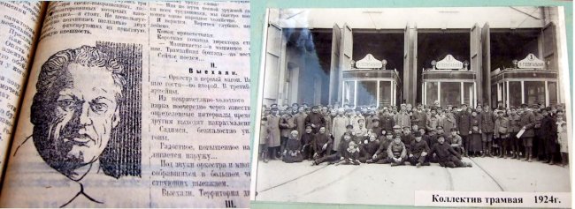 Портрет П. Д. Твердунова в «Красном Крыму» и коллектив трамвайного депо 1924 года. Фото автора.