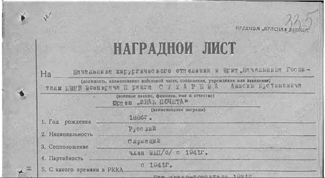 В военном архиве сохранился наградной лист на Онисима Сухарева, ещё с февраля 1942-го, керченский. Тогда военврач второго ранга начальник санитарной службы Керченской военно-морской базы Семён Матвеевич Дибнер представлял нашего героя к ордену «Знак Почёта», аналогу того, что уже был у Онисима Иустиновича, довоенный от Наркомздрава Крымской автономии, за «отличную постановку работы в Феодосийской больнице». Но в итоге приказом по Черноморскому флоту наградили орденом Красной Звезды. «Керченский военно-морской госпиталь в период десантной операции является основной базой приёма, оказания помощи и эвакуации раненых. Через госпиталь прошло свыше трёхсот раненых, обмороженных. Из них большая часть тяжело раненых, которым, благодаря самоотверженной работе всего персонала во главе с его начальником товарищем Сухаревым, была оказана квалифицированная, своевременная помощь, спасены жизнь и работоспособность. Своевременно оказанной помощью путём смелой и быстрой операции спасены жизнь и сохранена трудоспособность начальника политотдела Керченской военно-морской базы полкового комиссара товарища Лесникова, получившего тяжёлое ранение в район левого бедра. Товарища Лесникова эвакуировали в тыл в хорошем состоянии (начполитоотдела Константина Васильевича Лесникова, участника десанта, орденом Красной Звезды наградят через два месяца, за организацию высадки и то, что даже раненым, истекая кровью, не спасовал. Кстати, в Керченской военно-морской базе служил и иной Лесников, Михаил Матвеевич, он числится без вести пропавшим в 1942-м. - Ред.). Умелыми действиями товарища Сухарева и дальнейшим уходом сохранена жизнь тяжело раненому командиру 825-го полка майору Третьякову (Алексея Прохоровича за боевые успехи орденом Красной Звезды наградят в апреле 1943-го. - Ред.). Товарищ Сухарев пользуется авторитетом как хороший специалист, имеет ряд научных трудов. Несмотря на свой возраст, во время поступления большого количества раненых, работал у операционного стола по несколько суток»…