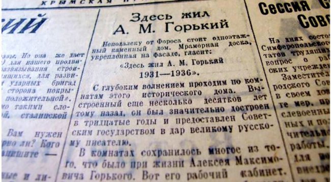 Репортаж с дачи Тессели, где жил писатель, опубликован в марте 1953-го. Фото автора. Его имя носит одна из центральных улиц Симферополя, до того бывшая с 30 мая 1924-го Советской, а с 1839-го - Дворянской, той самой, по которой он ходил ещё никому не известным. Прогуливался, быть может, после трудной работы: мощения дорожек, подвозки тачек с песком, известью и бутом - храм святого Александра Невского строился тогда в городе. В честь него, правда, уже с иным именем, вошедшим в историю, эту улицу и переименовали летом 1936-го. В память об известном пролетарском писателе, «певце революции», как говорили. И ещё множество улиц в большинстве городов и сёл полуострова, Русский театр в столице республики, библиотека - в его честь, а с середины двадцатых прошлого века и более сорока лет существовало в Симферопольском районе (неподалёку от нынешней Клёновки) село Максим Горький. Известный писатель, самый издаваемый в Советском Союзе, кавалер ордена Ленина, пять раз номинированный на Нобелевскую премию по литературе; двукратный, ещё в Российской империи, 1903-й, 1904-й годы, лауреат Грибоедовской премии… 140 лет назад юношу не приняли в университет в Казани, а 133 года назад он впервые пришёл (пешком именно) на наш полуостров. «Что Крым?» Потом приезжал сюда очень часто, здесь лечился - помогало; хотя изначально, когда врачи, обнаружив заболевание лёгких, советовали поехать в Крым, говорил: «Что Крым? Ничего там нет хорошего. Вся почва проплёвана и кишит бациллами ˂…˃ чахоточные только и говорят, что о своём драгоценном здоровье, какая температура, сколько весу прибыло. Дрожат над ним, как скряги над деньгой. Противно». Но именно здесь ему становилось лучше, здесь он много писал. Однако мы не о том, не о творчестве, а о жизни. В 1953-м страна отмечала 85-летие писателя Максима Горького (Алексея Максимовича Пешкова - Горького), его уже не было 17 лет, но очень многое в Советском Союзе было связано с именем писателя, одно время жившего за границей, и при Империи, и при Советах. Сейчас, по мнению одних, эдакого барина, передвигавшегося по ещё небогатой Москве исключительно на личном авто, по мнению других - настоящего пролетарского автора, певца революции. У каждого - свой взгляд, свои любимые произведения писателя, свои ощущения. В конце марта 1953-го в «Крымской правде» своими эмоциями о поездке в дом, где жил писатель, поделился наш коллега Сергей Шантырь. «Неподалёку от Фороса стоит одноэтажный каменный дом. Мемориальная доска, укреплённая на фасаде, гласит: «Здесь жил А. М. Горький, 1931 - 1936». С глубоким волнением проходим по комнатам этого исторического дома. Выстроенный ещё несколько десятков лет тому назад, он был значительно достроен в тридцатые годы и предоставлен советским государством в дар великому русскому писателю. В комнатах сохранилось многое из того, что было при жизни Алексея Максимовича Горького. Вот его рабочий кабинет. Здесь два письменных стола - безмолвные свидетели его напряжённейшей работы над монументальной эпопеей «Жизнь Клима Самгина», многочисленными литературно-критическими статьями, его обширнейшей перепиской. По бокам одного из столов - высокие книжные полки. На них стоят любимые друзья А. М. Горького - книги, с которыми писатель никогда не расставался. «Книги, - говорил А. М. Горький, - источник знаний, самое удивительное творение человеческого разума. Я - 
