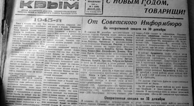 Так наша газета встретила 1945-й - 80 лет назад. Фото автора. Негромкий хлопок, от которого никто не вздрагивает, и комнату, всех и всё в ней, осыпают разноцветные кружочки конфетти, зелёные, красные, золотистые… И все смеются, внимательно осматривают пол, ведь среди крохотных кружочков иногда попадается пластмассовая фигурка, талисман на год. Сейчас хлопушки импортные, а раньше - небольшие, отечественные. Конфетти в хлопушках чаще были именно зелёного, красного, золотистого цветов - новогодних символов расцветка. В лесу родилась… Помните любимую новогоднюю песенку из советского детства (кстати, страна тоже предпраздничная, 30 декабря 1922-го рождённая). «В лесу родилась ёлочка,/ В лесу она росла./ Зимой и летом стройная,/ Зелёная была… Теперь она, нарядная,/ На праздник к нам пришла/ И много, много радости/ Детишкам принесла». Слова, как и сама традиция празднования Нового года в ночь на 1 января, в тогдашний Союз пришла из Российской империи, точнее, песенка оттуда. Песню о ёлочке создали творческие люди: текст - гувернантка Раиса Гедройц (в замужестве - Кудашева) написала в 1903-м для маленького воспитанника Алёши, а мотив к напечатанному в журнале стихотворению придумал для маленькой дочки Веры биолог Леонид Бекман, нотами записала его любимая Елена (в девичестве - Щербина). В Российской империи песня была рождественской (отмечали 25 декабря, по старому стилю), а в СССР стала новогодней, ведь «буржуазное» Рождество в пролетарской стране не принято… Зелёные ёлочки, сосенки на праздник в домах жителей Руси стали появляться 325 лет назад по велению царя Петра Первого, будущего (с 1721-го) императора. Его стараниями встречаем Новый год в ночь с 31 декабря на 1 января, как велено было, «с ёлками в домах, с пушечной стрельбой, фейерверками и гуляньями», на рубеже 1699-го - 1700-го. До того смену лет на нашей земле отмечали либо по осени, 1 сентября, с решения князя Киевской Руси Владимира Святославовича, связывая с окончанием полевых работ и сбором урожая (официально дату в конце XV века утвердил московский царь Иван Третий); либо по весне, с 1 марта, начала земледелия, или 22 марта - дня весеннего равноденствия. И новогодними растениями считались то снопы ржи и пшеницы, то ветви яблони и вербы. Но и ёлки быстро прижились - вечнозелёные (прекрасные даже без украшений - их в 1817-м ввела императрица Елизавета Алексеевна, любимая Александра Первого), символы жизни, продолжения. Такой смысл, надежду и веру в лучшее, в победу, помнили в Великую Отечественную жители блокадного Ленинграда и оккупированных Симферополя, Минска, Херсона, всех временно занятых врагом городов и сёл советской страны, когда угольками из буржуйки, крошками мела, камешком, просто водя пальцем по стенке, рисовали в новогоднюю ночь еловую веточку. И разведчики помнили, принося в роты и отряды небольшие новогодние деревца, их украшали письмами из дома и пустыми гильзами от патронов. А в осаждённом Севастополе в ночь на 1 января 1942-го новогодние ёлочки, что принесли с позиций бойцы, радовали людей в бомбоубежищах - довоенными игрушками. И песня о ёлочке звучала, и вспоминали, особенно, взрослые, с благодарностью вождя страны Иосифа Сталина. Празднование после Великой Октябрьской революции 1917-го ещё недолго было, в 1919-м устраивал новогоднюю елку детям пролетариев Владимир Ленин, волею которого годом ранее у с