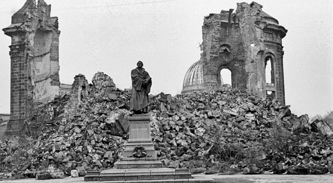 Руины собора Фрауэнкирхе (Церковь Богоматери) в Дрездене. Фото AP Photo. С 13 по 15 февраля 1945 года ВВС США и Великобритании осуществили одну из самых преступных бомбардировок Второй мировой войны. Массированному удару подвергся Дрезден, жемчужина Саксонии. Первые пристрелочные бомбы легли в районе городского стадиона, а затем нескончаемым потоком на головы горожан было скинуто семь тысяч тонн боеприпасов, рассказали корреспонденты «Российской газеты». Операция должна была начаться 13 февраля с удара 8-й воздушной армии ВВС США. Однако плохие погодные условия над Европой помешали участию американских самолётов. В связи с этим первый удар нанесла британская авиация. 13 февраля 796 самолётов Avro Lancaster вылетели двумя волнами и сбросили на город 1478 тонн фугасных и 1182 тонны зажигательных бомб. 14 февраля 311 американских бомбардировщиков Boeing B-17 Flying Fortress сбросили 771 тонну бомб. Их главными целями были железнодорожные сооружения. Ещё 466 тонн бомб американская авиация сбросила на Дрезден 15 февраля. После американские ВВС провели ещё две бомбардировки - 2 марта 406 бомбардировщиков B-17 сбросили на Дрезден 940 тонн фугасных и 141 тонну зажигательных бомб. А 17 апреля 580 бомбардировщиков B-17 сбросили 1554 тонны фугасных и 165 тонн зажигательных бомб. Бомбардировки велись по принятым в то время в англо-американской авиации методам. Сначала сбрасывались фугасные бомбы, чтобы разрушить крыши и обнажить деревянные конструкции зданий, а затем с неба на мирных жителей летели зажигательные бомбы. Третья волна бомбардировки проводилась вновь фугасными снарядами - в тот момент, когда на земле пожарные и военные пытались справиться с огнем. В результате бомбардировок образовывался огненный смерч, температура в котором достигала 1500 °C. К слову, точно такие же методы бомбардировок использовала авиация гитлеровской Германии. К примеру, по такой схеме бомбили 23 августа 1942-го Сталинград. По воспоминаниям очевидцев, всё вокруг превратилось в огненный ад. Взрывы бомб, крики погибающих, рушащиеся дома. Сами пилоты говорят, что летели над морем огня. Были стёрты с лица земли банки и магазины, гостиницы и рестораны, кинотеатры и церкви, больницы и школы, зоопарк и вокзал, мосты и железные дороги. Повреждения получили 80% зданий, а почти половина городских построек была уничтожена полностью. Площадь зоны сплошных разрушений в Дрездене в четыре раза превысила площадь зоны полных разрушений в японском городе Нагасаки после атомной бомбардировки. Сколько человек погибло от бомбардировок Дрездена, не известно до сих пор. В СССР, начиная с 1960-х годов, придерживались верхней планки, фигурировавшей в работах некоторых американских и английских историков, - 135 тысяч человек. В 2008 году комиссия немецких историков объявила, что в действительности жертвами бомбардировок стали от 18 до 25 тысяч жителей Дрездена. Сейчас число жертв оценивается от 25 до 200 тысяч человек. Американский писатель Курт Воннегут находился в это время в Дрездене в качестве военнопленного. Он сравнивал руины города с лунным пейзажем: «все камни раскалились, вокруг была смерть». «Ясно было только одно: предполагалось, что всё население города, без всякого исключения, должно быть уничтожено, и каждый, кто осмелился остаться в живых, портил дело, - писал он. - Людям оставаться на Луне не полагалось». Дрезден, в предыдущий 