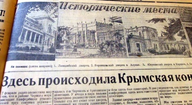 И появилась 8 февраля, 80 лет назад, в специальном выпуске «Красного Крыма» заметка: «Президент США, премьер Советского Союза и премьер-министр Великобритании в сопровождении своих начальников штабов, а также трёх министров иностранных дел и других советников совещаются в настоящее время в районе Чёрного моря». Секретность соблюдалась, ведь полуостров всё ещё оставался в зоне действия германской авиации, базировавшейся в Северной Италии, наши ПВО развернулись особо бдительно, вот и в Симферополе на месте Детского парка зенитные орудия стояли. О том, что встреча в Крыму, узнали после 14 февраля, когда самолёты иностранных делегаций садились уже на своих аэродромах. А точное место раскрыли через месяц, 23 марта, наши коллеги, Дмитрий Холендро, Моисей Олинский и Леонид Яблонский, сделали спецрепортаж, «Исторические места. Здесь происходила Крымская конференция». Фотографии дворцов Южнобережья, Юсуповского в Кореизе, где жила советская делегация, Воронцовского в Алупке, где остановились англичане, Ливадийского, где жили американцы и, из-за недуга президента США, передвигавшегося в инвалидном кресле, проходили встречи.