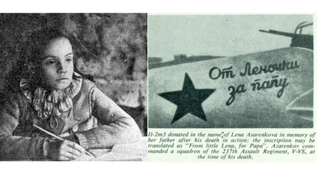 Лена Азаренкова. Фото с сайта deti-geroi.ru / Самолёт с надписью «От Леночки за папу», построенный на народные сбережения. Фото с сайта oper.ru Письмо, от которого прослезился сам Сталин. 1942 год. Первоклассница Леночка Азаренкова пишет письмо вождю. «Мама погибла во время эвакуации, прямо под авианалётом. Отец, командир эскадрильи штурмовой авиации, пал в бою, защищая нашу Родину. Осталась только больная бабушка. Она так много плачет. При получении пенсии она дарит мне игрушки. Я копила деньги на ёлку и накопила 110 рублей. Пусть эти деньги пойдут на новый самолёт, как у папы. Чтобы мстить за маму, папу, бабушку и за меня». Письмо попало к Сталину. Он прочитал его, и надолго задумался. «Эту страну они хотят победить», - едва сдерживая слёзы, произнёс он. По его поручению письмо публикует журнал «Огонёк» и газета «Пионерская правда». И что началось потом? Детские переводы хлынули со всей страны. Конфетные, ёлочные, игрушечные сбережения. Дети отдавали всё ради Победы. В уральской школе дети собрали 3000 рублей за неделю на танк. Так появился танк Т-34 с надписью «Боевая подруга». А вскоре на фронт вылетел новенький штурмовик Ил-2. На борту надпись «От Леночки за папу». Лётчики ответили письмом: «Мстим и будем мстить за твоего отца». Письмо всего одной девочки оживило веру миллионов. Оно напомнило: у нас есть за что и за кого бороться. Маленькие руки - большое сердце. Они тоже ковали Победу. Источник: gigi.click