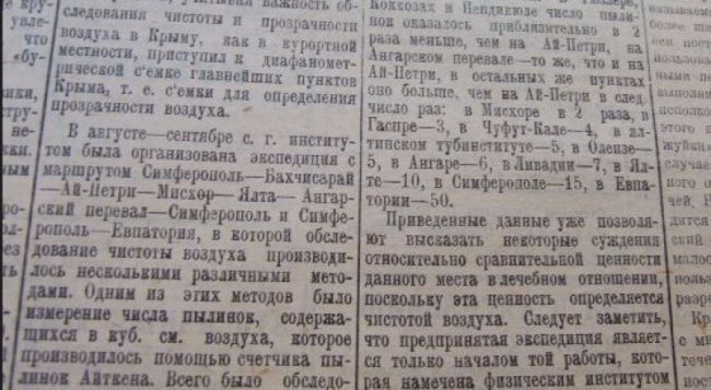 Прошлое всегда тесно переплетается с настоящим, даже на страницах нашей газеты, издания с более чем 107-летней историей. Это, в общем-то, и неудивительно, ведь поколения журналистов пишут о поколениях крымчан, истории и развитии одного края, лишь имена-времена меняются, да техническо-социальная жизнь совершенствуется. Вот сообщает «Крымская правда» новость современную: с сентября на полуострове, в Ялте, появится волюметрическая станция (таких в мире всего 600 работает), которая позволит определять «активности в воздухе спор грибов, пыльцы амброзии, кипариса, сосны, других растений и прогнозировать опасные для аллергиков периоды, чтобы вовремя начинать и корректировать терапию». Появится новинка на базе Академического научно-исследовательского института имени Ивана Сеченова. А вот «Красный Крым» (название нашей газеты с 1920-го по 1952-й) сто лет назад, в ноябре 1925 года, рассказал о новшестве того времени, связанном со слежением за качеством воздуха, вновь в Ялте, ведь там - плато Ай-Петри, рекордсмен полуострова по многим показателям, в том числе, по количеству туманных дней, ветру и качеству воздуха (последнее, естественно, вдали от автопути, ближе к вершине, к примеру на высочайшей точке плато Эндек, 1371 метр над уровнем моря).