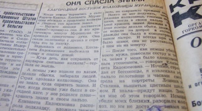 Красное знамя - гордость тружеников, хранили и спасали, порой рискуя жизнью. Как во время оккупации полуострова с фашистами поступила Елизавета Муромцева из села Карача-Кангил (Красная Зорька Симферопольского района). Осень 1941-го, фашисты уже на окраине села, в это время женщина забежала в правление колхоза, там осталось Красное знамя, на котором вышиты портреты Владимира Ленина и Иосифа Сталина, знамя колхоз «Сталинец» получил как самый передовой в районе. Понимала Елизавета Евдокимовна, что сожгут враги стяг, не смогла этого допустить, спешно открепив полотнище от древка, спрятала за пазуху. Дома зашила в подкладку пальто, враги уже обшаривали село. И все два с половиной года оккупации хранила, надевала пальто, когда забирали на допросы в гестапо, и в концлагере в нём была - к счастью, выпустили. Вспоминала: «После того как немцы убили моего мужа, повесили сестру и зятя, знамя у меня было единственным утешением. Ночами, страдая от бессонницы, я извлекала из пальто полотнище и часами смотрела на портреты Ленина и Сталина, вышитые цветным шёлком. Я знала, придут наши, знамя мне об этом говорило. Немцы убили моих близких, разорили колхоз, но им не досталось знамя нашего колхоза. Я сберегла его от немецких захватчиков». 18 апреля 1944-го, когда пришли наши, вручила спасённое знамя воинской части 1080ЗЛ, освобождавшей село», акт о том подписал командир части гвардии капитан Левин, а заметку написал в газету майор В. Куценков.