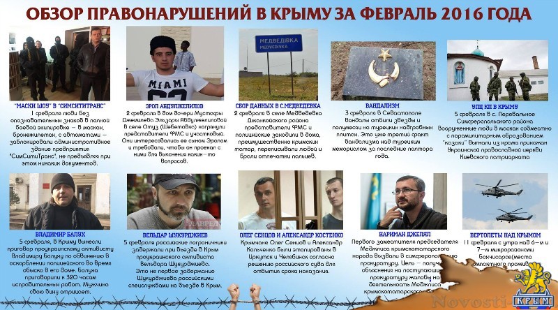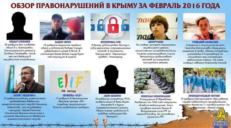 Кримскотатарский ресурсный Центр подготовил визуальный обзор правонарушений в Крыму за февраль 2016 года. «Цифра шокирующая – больше 40 правонарушений за 29 дней. Для сравнения, в обзоре за январь было 13 правонарушений», – сообщается на официальной странице ресурсного центра в Facebook. Отметим, ранее сайт «Новости Крыма» публиковал обзор нарушений прав человека на территории аннексированного полуострова за январь 2016 года. Напомним, в марте 2014 года Россия оккупировала Крым, обосновав свои действия итогами местного «референдума» об отделении от Украины. Однако результаты плебисцита, проведенного вопреки украинским законам и под контролем российской армии, не были признаны в мире. США и страны Евросоюза ввели санкции против России.