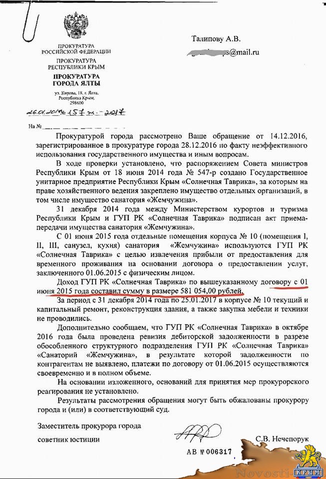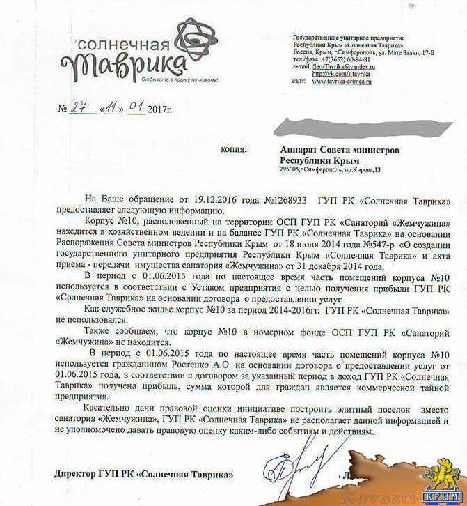 «Стала известна стоимость проживания главы администрации Ялты в отдельном корпусе Государственного санатория «Жемчужина». Согласно ответа Прокуратуры Ялты, Ростенко платит за возможность проживания в отдельном корпусе оздоровительного санатория, посреди чудесного парка, с собственным пляжем, на закрытой территории, около 29 тысяч рублей в месяц!» — пишет Талипов.