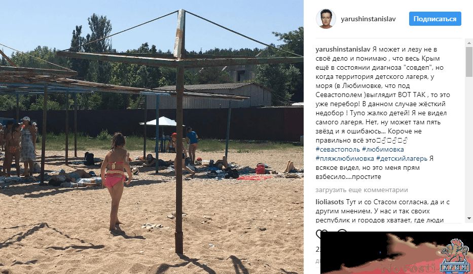 «Я, может, и лезу не в свое дело и понимаю, что весь Крым еще в состоянии диагноза «совдеп», но когда территория детского лагеря, у моря (в Любимовке, что под Севастополем) выглядит вот так, то это уже перебор! В данном случае жесткий недобор! Тупо жалко детей! Я не видел самого лагеря. Нет, ну, может, там пять звезд, и я ошибаюсь… Короче, неправильно все это. Я всякое видел, но это меня прям взбесило, простите», — написал Ярушин в своем Instagram.
