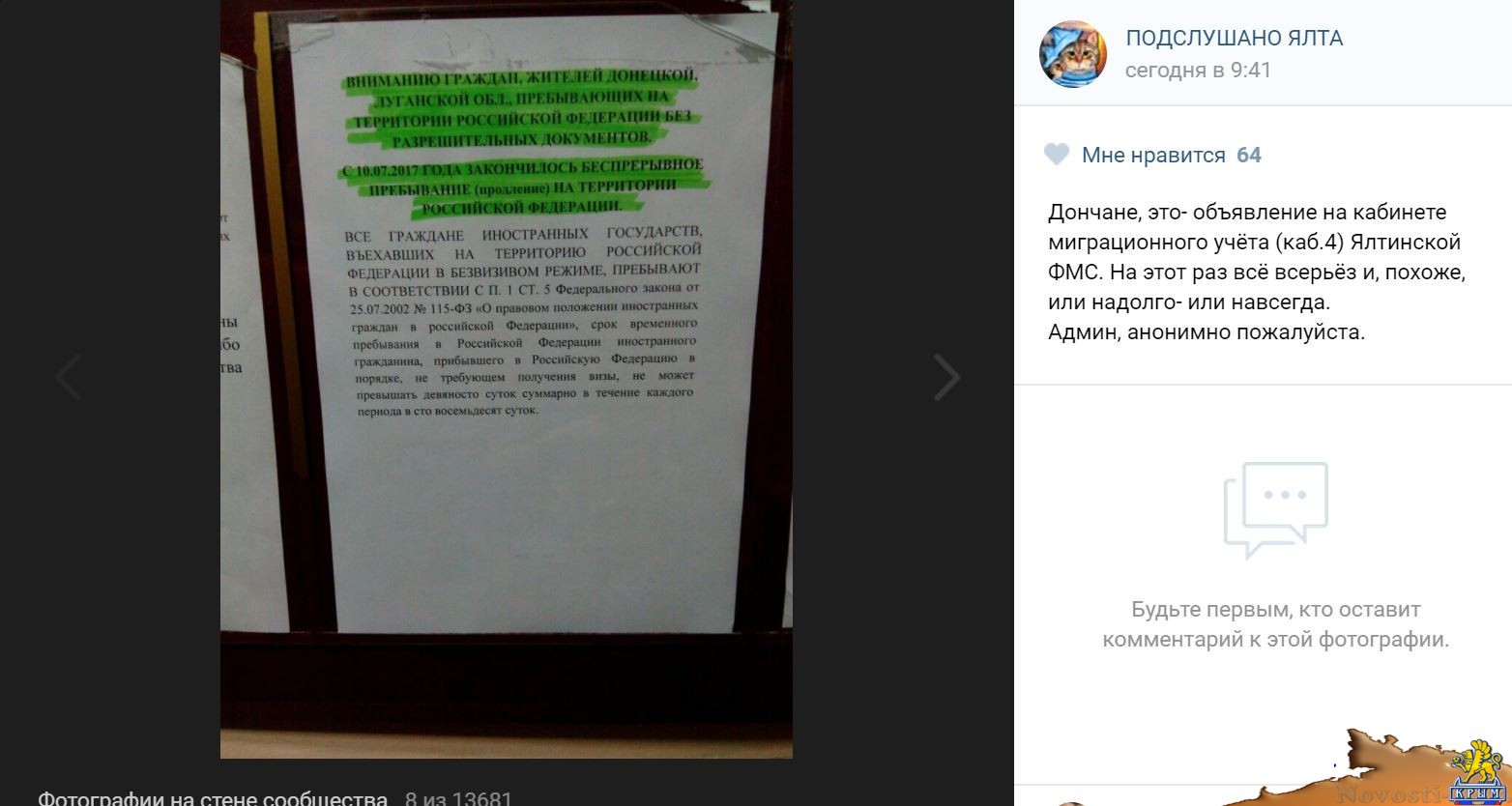 О том, что введены новые правила для жителей ДНР и ЛНР, не имеющих разрешительных документов, крымчане узнали из социальных сетей. В группе «Подслушано в Ялте» неизвестный пользователь опубликовал фото объявления из местного отделения ФМС.