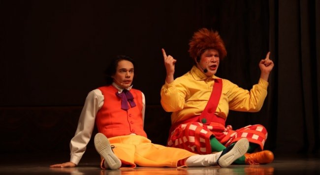 Сцена из спектакля «Малыш и Карлсон». К ним готовятся Крымский ТЮЗ и Санкт-Петербургский детский драматический «Театр у Нарвских ворот». Они пройдут при поддержке Министерства культуры Российской Федерации в рамках программы «Большие гастроли для детей и молодёжи», организованной Федеральным центром поддержки гастрольной деятельности, а также Министерства культуры РК. Питерцы приедут в Евпаторию в последний весенний месяц. 19 мая гости покажут спектакль-фантазию «Бармалей» режиссёра Виктора Чепрасова. Действие «детского триллера», написанного в Ленинграде Корнеем Чуковским почти 100 лет назад, перенесено в наше время. В спектакле много музыки и танцев, он искрится блестящими шутками, репризами и смешными цитатами из сказок, эстрадных шлягеров и даже оперных произведений. Костюмы, реквизит и декорации выдержаны в духе безудержного «африканского» оптимизма. 20 мая крымчане встретятся с героями знаменитой трилогии Астрид Линдгрен в постановке «Малыш и Карлсон» режиссёра Ольги Парфёновой. Пересказывать сюжет излишне - он известен всем, от мала до велика. Остаётся только отправиться в Евпаторию, чтобы ещё раз повеселиться вместе с Малышом и неутомимым летуном, специалистом по пылесосам, мышеловкам и паровым машинам, уплетателем тефтелек и укротителем домомучительниц Карлсоном. 21 мая петербургские артисты по воле режиссёра Романа Кахмена превратятся в героев арабской сказки «Аладдин и волшебная лампа» и вовлекут зрителей в полное опасностей увлекательное путешествие. Все переживания за Аладдина, против которого задумал козни злой волшебник, закончатся бурными аплодисментами. Крымский ТЮЗ отправится в Северную Пальмиру в сентябре. И представят на сцене дружественного театра 22, 23 и 24 сентября русский народный блокбастер «ГУСИЛЕБЕДИ.RU» режиссёров Анастасии и Андрея Пермяковых, комедию «Два билета на ковчег» в постановке Сергея Новикова, спектакль-игру «Волшебник Изумрудного города» режиссёра Андрея Пермякова. А 25 и 26 сентября спектакли эти покажут на сцене Выборгского Театра драмы и кукол «Святая крепость».
