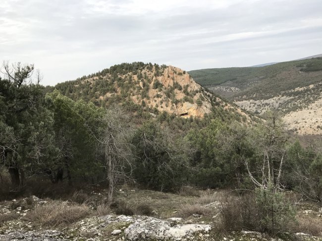 Вторую попытку предприняли на следующий день. На этот раз тщательно проверили координаты и не прогадали. Едем в сторону села Морозовка, рядом с местом проведения байк-шоу. Небольшой подъём через сосновую лесопосадку, дальше тропинка через низкий лес, заросший кустарниками. И вот с открытой площадки нам открывается вид на соседнюю гору. А там он - грот Мурзак-Коба. Кажется, пройти будет легко.