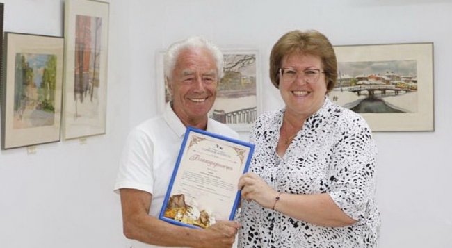 Светлана Емец вручает Александру Басову Благодарность. Фото Алексея МАРКОВА. В чутком сердце выдающегося крымчанина, заслуженного художника Украинской ССР, народного художника Украины, лауреата Государственной премии АРК Якова Басова вместилась любовь к Ленинграду, где он учился по рекомендации первого наставника в профессии академика живописи Николая Самокиша в Институте живописи, скульптуры и архитектуры, и к городу русской славы Севастополю. В названии выставки, которая экспонируется в музее-заповеднике «Судакская крепость» - зримое отражение этой любви. - Мы принимаем уже четвёртую выставку картин патриарха крымской акварели за последние четыре года, - отметила директор музея-заповедника Светлана Емец. - И каждая - яркое событие, раскрывающее новые грани творчества мастера. Художника нет с нами уже девятнадцать лет, но на каждой выставке, которые все эти годы организует его сын Александр, мы ощущаем его присутствие, глядя на талантливые произведения. Благодаря творческой манере автора зрители живо воспринимают изображённое. Щедрый мастер, произведения которого экспонировались при его жизни на 37 выставках в 22 странах мира, подарил более 600 работ крымским музеям. Многие из них находятся в постоянных экспозициях Ливадийского дворца-музея, Алупкинского государственного дворцово-паркового заповедника, Бахчисарайского историко-культурного и археологического музея-заповедника, художественных музеях Симферополя и Севастополя. Работы крымчанина пополнили фонды 42 музеев мира. Традицию дарений, заложенную художником, продолжает его сын. На этот раз он подарил картину «Генуэзская крепость в Судаке». - На созданных в разные годы акварелях запечатлены виды Ленинграда и Севастополя, - отметил Александр на вернисаже. - Думаю, даже хорошо знающие эти города откроют для себя новые грани любимых мест: набережных Фонтанки и Мойки, Михайловского замка, Адмиралтейства, Летнего сада, севастопольских улочек, Приморского бульвара. Времена их изменили, и всегда интересно, углубившись в былое, прикоснуться к истории. До Судака работы побывали в Феодосии, где экспонировались в музее Александра Грина. Выставку в Судаке можно увидеть до 25 октября.