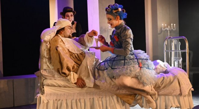 Сцена из спектакля. Фото Константина Пикулина. И, надо сказать, неплохо устроился на сцене Крымского ТЮЗа, найдя здесь полное понимание у режиссёра Нины Пермяковой и художника-постановщика Сергея Пермякова. Написанная смертельно больным драматургом, эта комедия оказалась одной из самых весёлых и жизнерадостных, вышедших из-под пера мэтра. Он сам с блеском трижды сыграл главную роль - престарелого самодура Аргана, объявившего себя неизлечимым больным, выдавшего дочь замуж против её воли, якобы заботясь о ней, а на самом деле из собственной выгоды. Темы, поднятые классиком 350 лет назад, не потеряли актуальности. Яркая, взрывная комедия о семье и любви, преданности и предательстве, о человеческой мнимости и готовых сыграть на этом шарлатанах, даёт возможность посмотреть на себя и окружающих со стороны. От постановщиков пьесы, коих оказалось немало после выхода комедии, требовалось одно - следовать традициям фарса, от артистов - непринуждённо и беззаботно высмеивать человеческие пороки через скандальные происшествия и выходки героев. ТЮЗовцы нашли свои краски, оригинально смешав их в театральной палитре. На премьерном спектакле зрители повеселились от души, живо откликаясь на искромётный юмор, заложенный в пьесе, и подчёркнутый острым сценическим гротеском. С созданием образа мнимого больного Аргана блестяще справился Сергей Толстых. Достойными партнёрами оказались Алёна Лукашевич в роли служанки Туанетты, Елена Петрова, сыгравшая дочь Аргана Анжелику. Страдания возлюбленного Анжелики передал Дмитрий Шершов. Явившийся на выручку влюблённой паре брат Аргана Беральд - актёр Олег Погорелец - внёс новую нотку в сюжетные перипетии, передав шарм, лёгкость и рассудительность своего персонажа. Вильгельмина Меттель органично вписалась в действо в роли беспринципной и алчной жены Аргана Белины. Как и Юрий Щадукин в роли её друга-нотариуса господина Бонфуа, вызывавший у зала безудержное веселье. Смех сопровождал и продуманные режиссёром до мелочей действия отца и сына Диафуарусов, образы которых вылепили Владимир Миллер и Сергей Новиков. Насладившись увиденным на сцене, зрители наверняка задумаются над отправленным в зал посылом автора пьесы и режиссёра. Комедии Мольера не только для потехи. Таким получился и спектакль. Следующий премьерный показ - 12 мая.