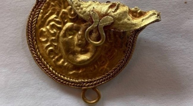 Такой Медузу обнаружили археологи. Фото фонда «Археология». Обнаруженные на разграбленном украинскими «чёрными копателями» керченском некрополе Кыз-Аул золотые украшения удалось полностью отреставрировать, сообщил корреспондент «Российской газеты». По словам замгендиректора Восточно-Крымского историко-культурного музея-заповедника Натальи Быковской, самый ценный артефакт - подвеска Медузы Горгоны - была сильно деформирована и практически разломана пополам, по ней шли крупные трещины. Однако реставраторам удалось восстановить её первоначальный вид. Напомним: уникальные экспонаты времён античности были найдены весной этого года в отвале грунта, который остался после того, как некрополь вскрывали экскаватором. Золотые украшения - серьга с полудрагоценным камнем, фрагменты ожерелья и подвеска с изображением Горгоны, а также бронзовые бусины с узорами, маленькая амулетница и фрагменты фибулы - были переданы специалистам для реставрации. Реставраторам удалось восстановить первоначальный вид ценного артефакта. Фото vk.com/video/@kerchnovosti Находки датируются I веком нашей эры и предполагается, что, кроме практической функции, несли ещё и обрядовую. Так, изображения Медузы Горгоны римские легионеры носили на доспехах или медальонах, считалось, что оно уберегает от неприятностей. Как сообщают керченские СМИ, сейчас музей готовит экспонаты для отдельной тематической выставки золотых античных украшений, найденных в десяти некрополях Крыма. Екатерина ЗАСЛАВСКАЯ.