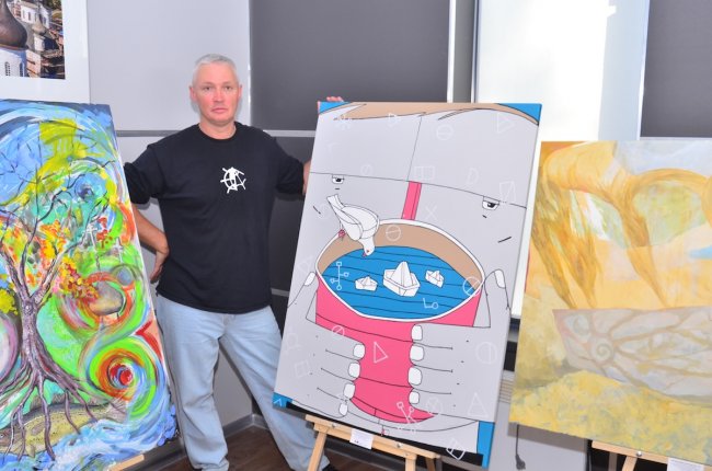- Если в Новом Свете я изобразил отдыхающих на АРТ-пляже в виде бутылок, то здесь, на Соловках (в Белом море купаются только смельчаки), появился диптих (произведение из двух картин, рисунков и т. п., объединённых одной идеей, темой и сюжетом. - Прим. ред.) «Берег танцующих берёз»: одна работа - в лучах восходящего солнца, вторая - в закатном свете, - рассказал художник. - И ещё одной работой сделал коллективный портрет участников симпозиума, нарисовал живописного кота (но мне кажется, это автопортрет самого Дмитрия, весёлого, задорного, талантливого художника. - Прим. автора).