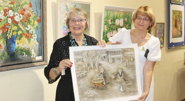 В благодарность за сотрудничество художница подарила музею свою картину и женскую кожаную сумочку конца XIX века, которая принадлежала её бабушке. Момент передачи подарка заместителю директора музея Людмиле Науменко запечатлела завотделом информации и культурно-просветительной работы Евгения Баранова.