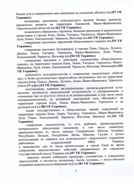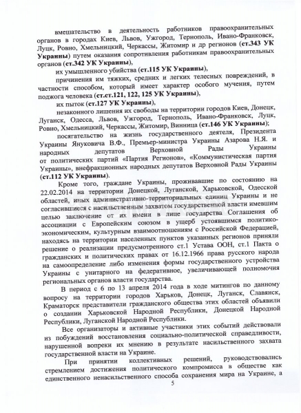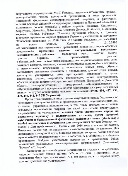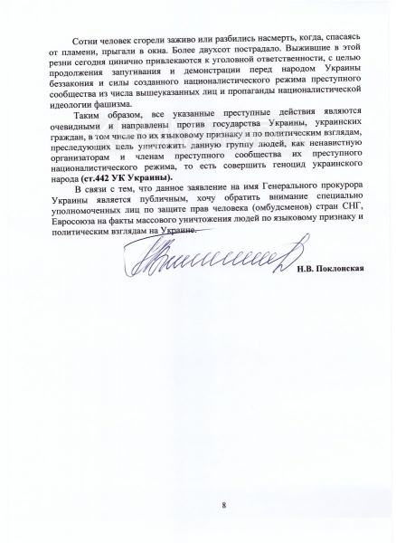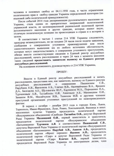 Направленный на имя Луценко документ носит статус публичного заявления. «Данное заявление является открытым и публичным специально для того, чтобы обойти тот информационный барьер, созданный на Украине. Действующая власть, руководители страны – это те организаторы преступлений – специально делают невозможным получение информации о происходящем в стране. Люди должны обладать объективной информацией. Пусть украинский народ знает имена преступников, которые сегодня уничтожают украинский народ», – сказала Поклонская.
