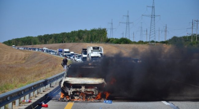 Кроме того, сотрудники МЧС РФ тушили горящий автомобиль на трассе «Таврида», в Бахчисарайском районе Крыма. Дорога была перекрыта некоторое время, из-за чего образовался затор. Некоторые «умные» граждане начали возмущаться в соцсетях, мол, почему дорогу перекрыли, а машину не тушат.