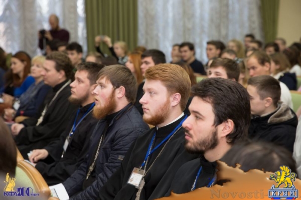 Фото пресс-службы КФУ Симферополь, 23 ноября. Крыминформ. Первый православный молодежный образовательный форум «Молодежь и вера» состоялся в Крымском федеральном университете им. В.И. Вернадского. Как сообщила сегодня пресс-служба КФУ, организаторами форума выступили молодежный отдел Симферопольской и Крымской епархии православной церкви при поддержке министерства образования, науки и молодежи РК и Крымский федеральный университет. В форуме приняли участие более 100 молодых людей, среди которых лидеры и активисты молодежных общественных организаций и объединений. Главная тема форума – «Нравственные ценности и развитие молодежи». Приветствуя участников, и.о. ректора Крымского федерального университета имени В. И. Вернадского Андрей Фалалеев отметил, что «Крым – это богохранимая земля». «Такие большие геополитические процессы, которые произошли у нас, которые всколыхнули весь мир, и при этом не пролилась ни одна капля крови – всё это не могло произойти просто так. Несмотря на санкции, которые негативно влияют на развитие экономики, вы понимаете, что Крым – это место, хранимое Господом. У нас есть шанс отстроить его так, чтобы оно было красивейшим местом на земле, которое бы цвело как сад. Для этого нужны вы, ваши знания, ваша вера, ваши старания в дальнейшем», – обратился к присутствующим ректор. Он напомнил, что отличным примером для КФУ является Святитель Лука Крымский, в котором уникально сочетались тяга к знаниям, к науке и практической деятельности медика со страстью к богу и вере. О необходимости сочетания в современных специалистах профессиональных качеств и духовных основ говорил на открытии форума и митрополит Симферопольский и Крымский Лазарь. «Сегодня всему нашему обществу, в разных важных областях и сферах человеческой жизни, необходимы всесторонне подготовленные специалисты. В таких специалистах нуждается и наша церковь. В то же время очень важно, чтобы профессионалы своего дела были причастны и к спасительным основам духовных традиций своего народа. Поэтому надеюсь, что наше нынешнее соборное сотрудничество на благой стезе духовно-нравственного воспитания молодёжи в скором времени принесёт свои ощутимые плоды», – сказал Лазарь. О деятельности министерства образования, науки и молодежи Крыма в этом направлении рассказала замминистра Оксана Красникова. «Наше общество состоит из личностей, а личность, как известно, многогранное понятие, которое включает в том числе и духовно-нравственные и моральные ценности, которые важны для общества. Работа по возрождению православия, по возрождению духовности давно уже проводится министерством образования и науки Республики Крым. В школах есть курсы «Основы православной культуры», «Религии мира», школьники могут выбрать то, что их интересует, и это действительно очень важно и нужно сегодня в нашем обществе», – заключила заместитель министра. _
