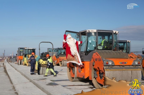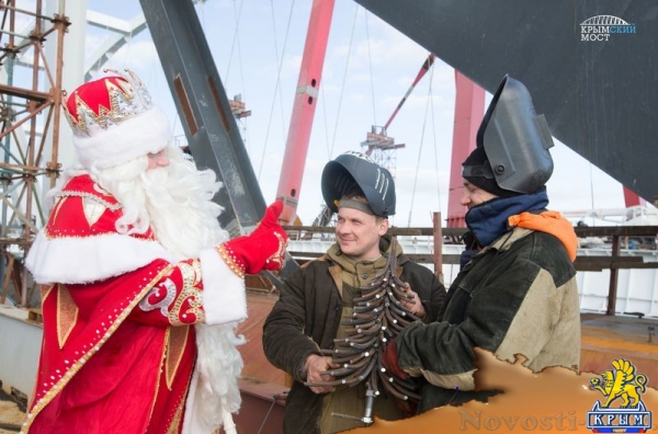 Фото инфоцентра «Крымский мост» Симферополь, 9 декабря. Крыминформ. Дед Мороз из Великого Устюга прибыл на Таманский полуостров, чтобы пройтись по Крымскому мосту. Об этом сообщил инфоцентр «Крымский мост». «Дух захватывает! Крымский мост – это то чудо, которое объединяет людей, живущих на разных берегах Керченского пролива. Больше всего впечатлила слаженность команды, которая работает на этом мосту», – сказал Дед Мороз. Строители показали ему процесс подготовки к асфальтированию проезжей части. Готовясь к встрече, они также украсили технику мишурой, шарами и снежинками. Сварщики соорудили из арматуры новогоднюю елку высотой 60 см и весом около 16 кг. «На такой большой стройке иногда забываешь про праздники, а Дед Мороз подарил нам новогоднее настроение», – отметил строитель Иван Алексеев. Дед Мороз также встретился с детьми, живущими по обе стороны Керченского пролива. Увидеть его смогли тысячи ребят Тамани и Керчи. «На Крымский полуостров он перешел по мосту: часть маршрута – по готовым пролетам, остальную – по рабочим мостам и технологическим площадкам», – пояснили в инфоцентре. Новогодний волшебник проверил качество покрытия, постучав по нему своим посохом. Автомобильное движение по Крымскому мосту запустят в 2018 году, а железнодорожное – в 2019 году. Фотографии