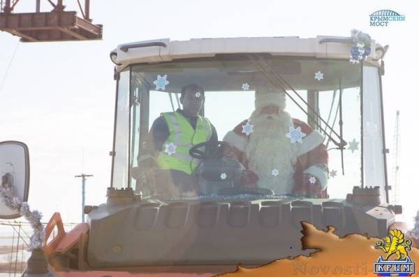 Дед Мороз также встретился с детьми, живущими по обе стороны Керченского пролива. Увидеть его смогли тысячи ребят Тамани и Керчи. «На Крымский полуостров он перешел по мосту: часть маршрута – по готовым пролетам, остальную – по рабочим мостам и технологическим площадкам», – пояснили в инфоцентре. Новогодний волшебник проверил качество покрытия, постучав по нему своим посохом.