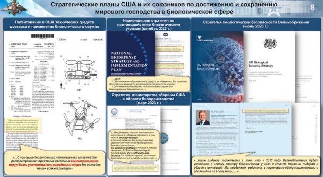 «Хотел бы напомнить, что согласно утверждённым стратегическим документам в области биопроизводства и противодействия биологическим угрозам Соединённые Штаты оставляют за собой право проводить исследования «двойного назначения» и управлять биологической обстановкой в своих интересах. Активно поддерживая такую деятельность, Великобритания заявила о собственных интересах в биологической сфере, приняв 12 июня 2023 года национальную стратегию биологической безопасности. Одной из заявленных целей документа является «достижение мирового лидерства в области инноваций». Объём финансирования мероприятий в рамках стратегии составит ежегодно полтора миллиарда фунтов стерлингов, - подчеркнул генерал-лейтенант Кириллов. - Таким образом, Соединённые Штаты Америки при поддержке своих союзников осуществляют широкомасштабные военно-биологические исследования, направленные на поиск эффективных методов применения возбудителей инфекционных болезней. Реализация подобных планов позволяет формировать искусственные очаги особо опасных инфекционных заболеваний. Рассматриваем это, как ещё один аргумент в пользу проведения международного расследования военно-биологической деятельности США».