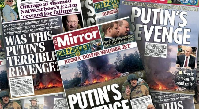 Первые полосы британских газет в день украинской «незалежности». Фото для коллажа Владимира КОРНИЛОВА. Вокруг любого резонансного события всегда возникает множество сплетен и кривотолков. Трагедия в Тверской области - именно такое событие. Поэтому начнём с сухих фактов. А выводы пусть сделает следствие. Всему своё время. 23 августа МЧС РФ сообщило, что в Тверской области, вблизи населённого пункта Куженкино, потерпел крушение самолёт (бизнес-джет) ООО «МНТ-Аэро», совершавший рейс Москва - Санкт-Петербург. Все 10 человек, находившиеся на его борту, погибли. «По данным авиакомпании, на борту самолёта Embraer-135 (EBM-135BJ) находились следующие пассажиры: Propustin Sergey; Makaryan Evgeniy; Totmin Aleksandr; Chekalov Valeriy; Utkin Dmitriy; Matuseev Nikolay; Prigozhin Evgeniy. Члены экипажа: Levshin Aleksei, командир; Karimov Rustam, второй пилот; Raspopova Kristina, бортпроводник. Выполнение полёта самолёта Embraer-135 (EBM-135BJ) осуществлялось на основании разрешения на использование воздушного пространства, выданного в установленном порядке», говорится в сообщении Росавиации от 23 августа. Следственный комитет России возбудил уголовное дело по ст. 263 УК РФ о нарушении правил безопасности движения и эксплуатации воздушного транспорта, на место происшествия выехала следственная группа. Гибель публичного лица ЧВК «Вагнер» вызвала немедленную реакцию в стане противника. Представитель Совета национальной безопасности США Эдриен Уотсон заявила, что «ни для кого это не должно стать сюрпризом». Американский президент Байден тоже оказался неплохо информирован. «Я точно не знаю. Но я не удивлён. В России мало что происходит, за чем бы не стоял Путин», - заявил «Сонный Джо». Высказался по поводу гибели руководства «Вагнера» и премьер-министр Японии Фумио Кисида. «Мы продолжим с пристальным вниманием следить за внутренней ситуацией в России», - цитирует заявление Кисиды РИА «Новости». Вы, вероятно, заметили общее место в этих высказываниях. Кому и зачем могла понадобиться смерть Евгения Пригожина? После провала мятежа, сдачи тяжёлого вооружения, отлучения от госфинансирования и от контрактов с Минобороны, публичная активность Евгения Викторовича снизилась почти до нуля, хотя часть его медиа-активов продолжала работу «по инерции». Но превратившись в прощённого мятежника, «лицом протеста» он уж точно не был. Тем временем в инфополе «разгонялись» польско-прибалтийские истерики по поводу опасности марша «Вагнера» на Варшаву и по Сувалкскому коридору, а также росло количество упоминаний о роли ЧВК в событиях на Африканском континенте - особенно в связи с антиколониальной революцией в Нигере… Директор Института политических исследований Сергей Марков отмечает мгновенный всплеск активности украинской пропаганды: «Они точно получили команду и стараются, очень стараются доказать, что это Путин дал приказ по Пригожину. Мне кажется, это косвенно доказывает, что российские власти не причастны к крушению самолёта Пригожина, а власти Украины причастны». Ту же повестку синхронно выдают органы западной пропаганды. «Но объяснить рационально, зачем Путину убирать Пригожина, который сейчас не представлял никакой политической угрозы, они не могут», - отмечает Марков. «Парадоксально, но гибель Пригожина отодвигает диверсию на «Северном Потоке» от англосаксонско-украинского следа. Западные эксперты будут использовать довод, мол, «если 