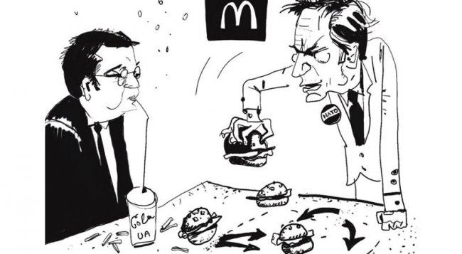 Рисунок Эдуарда Кулиша. Благодаря «Фабрике грёз», мы знаем, что бывают клоуны, способные внушать ужас. Благодаря нынешним политическим элитам Запада, мы получили возможность наблюдать, что бывает с беспощадными колонизаторами, когда они превращаются в клоунов. Печальна участь тех, кто, построив свою власть на страхе, начал терять силу. А именно это сейчас и происходит. «Надо что-то решать» «Суровая реальность такова, что цели Украины больше не совпадают с целями её сторонников», - заявил в статье для британской Sky News отставной вице-маршал королевских ВВС Шон Белл. По его версии, США и их европейские вассалы достигли поставленных целей - Россия достаточно ослаблена и больше не может угрожать Европе. Налицо попытка объяснить сложившееся положение, не выходя за рамки предписанной и многократно анонсированной «победы над агрессивной Россией». Получилось, сами видите, как. Однако тех, кто пытается хотя бы мягко указать на очевидную провальность нынешнего курса Вашингтонского обкома и его вассалов, пока ещё принято порицать и карать. Так, известный американский политолог, профессор Чикагского университета Джон Миршаймер за свою посвящённую украинскому «контрнаступу» аналитическую статью «Обречённые проиграть» был ошельмован коллегами, как «агент Кремля». «Теперь ясно, что с нетерпением ожидаемое контрнаступление Украины обернулось колоссальным провалом, - считает Миршаймер. - Украинское контрнаступление было обречено на провал с самого начала. Взгляд на расстановку сил с обеих сторон и на то, что пыталась сделать украинская армия, в сочетании с пониманием истории обычных сухопутных войн, даёт понять, что у атакующих украинских сил практически не было шансов победить обороняющиеся силы России и достичь своих политических целей». Ещё одним «агентом Кремля» имеет шансы стать известный американский экономист и профессор Колумбийского университета Джеффри Сакс. «Соединённые Штаты отошли от дипломатии, и Украина стала жертвой. И, разумеется, я бы сказал, что её руководство, на мой взгляд, совершенно не представляет интересы украинского народа, - сказал он в одном из недавних интервью. - Широко рекламируемое контрнаступление последних трёх месяцев не принесёт результатов. Но Байден собирается переизбираться. Зеленский упорствует. То есть, мы имеем этот ужасный феномен, когда интересы всего мира ставятся на карту ради интересов нескольких политиков. Это ситуация, в которой всё перевёрнуто с ног на голову». Визит госсекретаря Блинкена в Киев запомнился трогательным дуэтом в «Макдональдсе». Сетевые шутники даже начали предлагать коллекционерам приобрести за бешеные деньги недоеденную Кулебой украинской дипломатии и Блинкеном дипломатии американской жареную картошку. В щедро обещанный заокеанским эмиссаром очередной миллиард военной помощи, похоже, не очень поверили даже в Киеве. «Заявление Блинкена о готовности Украины идти на переговоры нацелено лишь на одно: снять с Киева и с Вашингтона обвинения, что они отказываются от переговоров и настаивают на продолжении военных действий. В условиях, когда за пределами западного альянса и самой Украины множатся призывы к прекращению войны и началу переговоров, это попытка госсекретаря США переложить ответственность за их отсутствие и продолжение военных действий на Москву, в