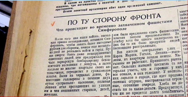 «По ту сторону фронта. Что происходит во временно захваченном фашистами Симферополе» - в декабре 1941-го написал наш Михаил Муцит (он погибнет, сражаясь в Севастополе). «После того как (29-30 октября. - Ред.) наши войска, выполняя приказ командования, оставили Симферополь, чтобы занять более выгодные рубежи для обороны, немцы ещё несколько дней не решались войти в город. Они предприняли варварскую бомбардировку беззащитного населения, а затем заселили во многие кварталы своих автоматчиков, переодетых в гражданское. Засев на чердаках домов, фашистские головорезы в течение двух суток «устрашали» население, поливая ливнем огня проходивших по улицам стариков, детей, женщин. Но это была лишь прелюдия. Несколько человек, которым удалось вырваться из фашистского ада, рассказывают, что, когда осмелевшие палачи вошли в город, начались поголовные грабежи, насилие, убийства. Прежде всего, разграблению подверглись квартиры военнослужащих (по воспоминаниям Хрисанфа Лашкевича, находились те, кто указывал врагу на семьи красноармейцев, прежде всего, офицеров. - Ред.). Затем последовали разбойничьи наскоки на все остальные жилища. Немецкие солдаты безнаказанно врывались в дома и забирали всё, что попадало под руки. Оказывавших хоть малейшее сопротивление, проявлявших хоть какое-то недовольство, расстреливали на месте. Специальным приказом предписывалось сдать запасы продовольствия. За утайку хотя бы килограмма продуктов беспощадно расстреливали. Жизнь города замерла»…