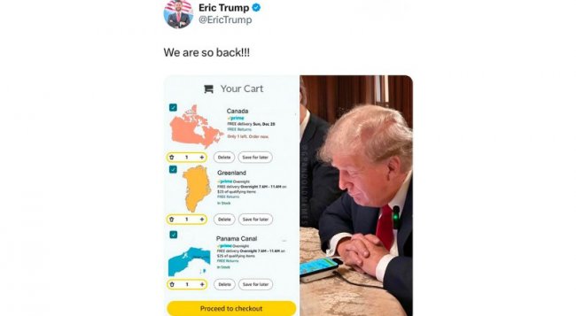 Шутливый пост в соцсети Эрика Трампа, который собрал «корзину» земель, приобретаемых его отцом онлайн с «бесплатной доставкой». Фото из открытого источника. «Миротворец» Трамп уже выступил с идеями забрать у Панамы канал, присоединить Канаду и Гренландию (купить которую у Дании он собирался ещё в прошлую свою президентскую каденцию). Звучала также идея вторжения в Мексику для борьбы с наркокартелями. Таким образом доктрина Монро, ознаменовавшая, как шутили тогда американские конгрессмены, начало «изгнания России из Америки» и отметившая год назад свой 200-летний юбилей, возвращается в новом прочтении. Под доктриной Монро понимается послание президента Джеймса Монро к Конгрессу США 2 декабря 1823 года. Специалисты впрочем указывают, что автором провозглашённых Монро принципов был госсекретарь Джон Куинси Адамс (бывший посол в России, старший сын 2-го президента, 6-й президент США в 1825-1829 гг.). Один из первых «специалистов по России», будучи послом в Петербурге, писал примерно то же, что и все ему подобные: «В целом эта нация далеко не цивилизованная, их привычки, их одежда и даже их развлечения являются варварскими». Два века назад Российская империя в Америке владела не только Аляской, но и Калифорнией, а согласно указу императора Александра I «производство торговли, китовой и рыбной ловли и всякой промышленности на островах, в портах и заливах и вообще по всему Северо-Западному берегу Америк, начиная от Берингова пролива до 51° северной широты», предоставлялось «в пользование единственно российским подданным». В ходе начатых переговоров Александр I пошёл на незначительные уступки, согласившись сдвинуть зону российских интересов до 54-й параллели. А спустя четыре десятилетия российских земель в Америке уже не осталось. Доктрина Монро не стала законом, но была утверждена «в качестве принципа», суть которого можно выразить так: поскольку США не вмешиваются в европейские дела, ни одна из стран Европы не вправе вмешиваться в дела США на обоих американских континентах, поскольку Западное полушарие - зона интересов США. «Трамп публично выдвинул идею «присвоения и контроля США над Гренландией» и возвращения Панамы из-за «смехотворных пошлин» для американских судов. Трамп также уже несколько недель называет Канаду потенциальным «государством» с премьер-министром Джастином Трюдо в качестве «губернатора», хотя, по словам источников, это просто насмешка. Но он не шутит, когда речь заходит о Гренландии и канале в рамках его стратегии «Америка прежде всего» по противодействию Китаю и России», - сообщает The New York Post. «Недавно Трамп заявил: «Я немедленно объявлю наркокартели иностранными террористическими организациями», что является открытой угрозой вмешательства в дела Мексики, пусть и на словах. Это не является новостью, ведь Трамп говорил то же самое в свой первый президентский срок. Он не стал тогда продолжать свои действия в этом направлении только потому, что президент Лопес Обрадор обуздал его рвение, предложив сотрудничество вместо вмешательства. В ходе своей новой атаки Трамп предупредил: «Я прикажу Пентагону использовать спецназ, кибервойска и другие тайные и открытые организации, чтобы нанести максимальный ущерб руководству, системе и деятельности наркокартелей». Тогда как в США эти картели ведут себя, как дома, и никто их 