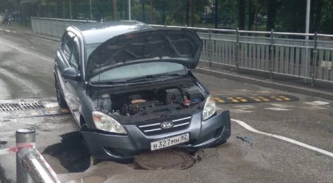 Фото из Telegram-канала AMS Simferopol. На улице Баррикадная в Симферополе после непогоды, обрушившейся на город, провалилось дорожное покрытие. На фотографии очевидцев, распространившейся в социальных сетях, видно, что в образовавшуюся яму попал автомобиль. «Сейчас там работают профильные службы, в частности, Служба автомобильных дорог РК, на балансе которой находится данная улица. В результате происшествия серьёзно никто не пострадал. Восстановительные работы будут проведены в сжатые сроки», — сообщил глава администрации Симферополя Михаил Афанасьев.