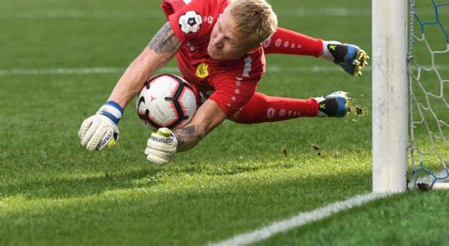 Так защищает ворота казанского «Рубина» 32-летний Юрий Дюпин, лучший страж ворот трёх туров нынешнего первенства России. В седьмой раз футболисты санкт-петербургского «Зенита» смогли стать чемпионами СССР и России, на этот раз досрочно, до финиша первенства, предъявив свои права на почётный титул. А уже 8 июля, когда проходили поединки 27-го тура, питерцы, облачившись в золотого цвета футболки с надписью «чемпион» после матча с ФК «Сочи», были увенчаны золотыми медалями чемпионов страны 2019/20 года, и им был вручён новый приз, который является переходящим для сильнейшей команды России. И что характерно для команды Сергея Семака, для которой оставшиеся четыре поединка нынешнего первенства уже ни в какой степени не имеют принципиального значения, она не желает уступать соперникам победу. Пропустив на 5-й минуте поединка гол от вчерашнего «зенитовца» Антона Заболотного (таких экс-питерцев сейчас немало в рядах сочинцев), сегодняшние жители города на Неве взвинтили темп поединка до предела. Под занавес первого тайма неутомимый бразилец Филипе Силва Малком мощнейшим ударом с лёта уложил мяч в «девятку» ворот соперников, а под занавес второго тайма иранец Сердар Азмун принёс своему клубу двадцатую победу в первенстве - 2:1. Итак, вопрос о «золоте» уже исчерпан. Остаются «серебро» и «бронза», открывающие путь в различные этапы Лиги чемпионов 2020/21 годов, на которые отныне могут рассчитывать четыре клуба - московские «Локомотив» и ЦСКА, наши соседи по Южному федеральному округу России «Краснодар» и «Ростов». И теперь к их трём поединкам в оставшихся турах, да и к отложенной игре кубанцев с московским «Динамо» будет приковано внимание всех болельщиков страны. В отчётном туре только «армейцы» столицы, вдруг нашедшие свои «стреляющие бутсы», смогли «всухую» разгромить «несчастливцев» из «Оренбурга» (4:0), которые после двухнедельного карантина из-за коронавируса впервые показались перед глазами своих 599 преданных болельщиков. И опять у москвичей» отличились Фёдор Чалов, хорват Никола Влашич, защитник Георгий Щенников и Иван Обляков. В это же время судьба столичного дерби между «Локомотивом» и «Спартаком» была решена уже в первом тайме. На гол аргентинца Эсекьеля Понсе через пять минут единственный ударный форвард «железнодорожников» Алексей Миранчук ответил чётким исполнением пенальти - 1:1. Не выдержали испытания в труднейшие минуты у себя на поле ростовчане, принимавшие уфимцев. А ведь шведский защитник с берегов Дона Деннис Хаджикадунич открыл счёт уже в начале матча, но затем на 69-й минуте ошибся в собственной штрафной площадке, и «башкир» Даниил Фомин с 11-метрового удара сравнял результат, а шесть минут спустя Вячеслав Кротов в прорыве принёс победу гостям - 2:1. И, наконец, в Казани «Краснодар» не смог устоять перед натиском команды Леонида Слуцкого и уступил ей с минимальным счётом - 0:1. Автором победного гола вновь стал молодой Денис Макаров. В оставшихся трёх играх обозреваемого тура преимущество имели гости. Самарские «Крылья Советов» не скрывали, что отправляются в Тулу в гости к «Арсеналу» только за победой, ведь «оружейники» после рестарта в первенстве резко сдали в игре. И их уверенность принесла сенсационную победу коллективу с берегов Волги (4:2). У гостей отличились Виталий Лысцов, словенец Денис Попович, Максим Глушенков, 