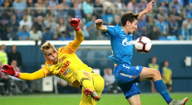 Вот так отчаянно защищает ворота московского «Спартака» Александр Максименко. Центральным матчем 10-го тура первенства России среди клубов премьер-лиги, вне всякого сомнения, была встреча в Москве «Спартака» и санкт-петербургского «Зенита». Ведь эти два популярных клуба пришли к поединку между собой, набрав по 20 очков, и вместе возглавляли турнирную таблицу. Кто станет единоличным лидером? Этот вопрос волновал всех на восьми стадионах, на которых новая волна пандемии собрала всего 66 тысяч зрителей, которые стали свидетелями двадцати забитых мячей при половине поединков, завершившихся вничью. Отчётный тур сохранил лидерское равновесие. Поначалу создалось впечатление, что спартаковцы более решительно настроены на победу. Но постепенно действующий чемпион страны нащупал свойственную ему игру. В воротах спартаковцев удачно действовал на этот раз вратарь молодёжной сборной страны Александр Максименко, который с десяток раз спасал свою команду от неприятностей. Но на 55-й минуте и он был бессилен после удара с лёту, нанесённого его тёзкой Ерохиным из пределов штрафной площади в нижний угол ворот. Однако москвичи не прекратили борьбу. И за четыре минуты до конца поединка их чешский полузащитник Алекс Крал закрутил своеобразную карусель у штрафной питерцев, а затем точно выложил мяч под удар своему аргентинскому коллеге Эсекьелю Понсе, и тот тоже метко уложил «круглого» в нижний угол ворот Михаила Кержакова - 1:1. В свою очередь дышащие лидерам, как принято говорить, в спину московские ЦСКА, «Локомотив» и «Динамо» плюс открытие нынешнего первенства «Сочи» смогли одержать победы, и, образно говоря, сжали меха растянутой турнирной гармони, что хорошо отражает сегодняшняя таблица первенства. Из этой компании преследователей «армейцы» играли в гостях в Екатеринбурге с «Уралом» и уже на первых минутах второго тайма, как принято говорить, застолбили за собой победу, после того как их новобранец казах Бахтиёр Зайнутдинов и молодой воспитанник клуба Константин Маради-швили на протяжении четырёх минут забили голы - 2:0. Все же остальные преследователи играли на своих стадионах при активной поддержке допускаемых на трибуны зрителей. Очередной успех отпраздновали сочинцы, сумевшие переиграть «Ростов», сместив его с третьего места в таблице первенства. Причём подопечные Владимира Федотова - Никита Бурмистров, Артур Юсупов и Антон Заболотный (дважды) провели в ворота Сергея Песьякова четыре красивых мяча, на что ростовчане - нынешний игрок сборной России Алексей Ионов и прежний Дмитрий Полоз - ответили лишь двумя - 4:2. Новичок из Белоруссии Виталий Лисанович, усиливший полузащиту «Локо», в игре с подмосковными «Химками» в середине первого тайма открыл счёт. Но уже на первой минуте второго тайма счёт стал равным после удара Кирилла Боженова. Почти тут же «многостаночник» москвичей защитник Владислав Игнатьев, как заправский форвард, забил победный гол - 2:1. А вот земляки «железнодорожников» - динамовцы принимали краснодарских «чёрных быков», которым накануне пришлось приложить немало сил, чтобы пробиться в групповой этап Лиги чемпионов. У динамовцев ушёл в отставку тренер Кирилл Новиков, и пока подыскивается главный тренер, команду готовил к игре второй тренер Александр Кульчий. И «бело-голубые» продемонстрировали отличную игру, за