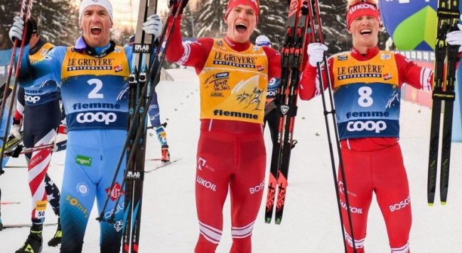 Вот они, лауреаты «Тура де Ски»-2021: Морис Манифика, Александр Большунов, Денис Спицов (на снимке слева направо). В первые дни нового года по странам Западной Европы пронёсся настоящий снежный цунами, который выкрасил в белый цвет, например, такую страну как Испания, вот уже пятьдесят лет не попадавшую в такие зимние тиски. Ну а на лыжных трассах у гонщиков в альпийских районах Швейцарии и Италии на протяжении десяти дней в пятнадцатый раз проводился популярный «Тур де Ски», входящий в розыгрыш Кубка мира 2021 года. На нём лыжникам, мужчинам и женщинам, предстояло провести по восемь различных гонок, последними из которых были восхождения на легендарную вершину крутой горы Альпе-де-Чермис, что расположена у итальянского курортного местечка Валь-ди-Фьемме. Мы уже рассказывали читателям нашей газеты, что считающиеся лидерами в лыжных гонках норвежцы, сборную страны которых возглавляют такие замечательные мастера как Йоханнес Клебо и Тереса Йохауг, после стартов в финской Руке из-за второй волны коронавируса решили пока прекратить борьбу за Кубок мира и не выезжать на состязания за пределы Норвегии. Но остальные сборные не испугались пандемии и приехали в швейцарский Валь-Мюстаир, где спринтерской гонкой стартовал «Тур де Ски». Её, как и предполагали специалисты, среди мужчин выиграл итальянец Федерико Пеллегрино, а вторым, к всеобщему удивлению, стал лидер российской сборной Александр Большунов, больше прославившийся на длинных дистанциях. И своё умение сражаться на них призёр олимпийских игр в Пхёнчхане-2018, как величают товарищи по команде Большунова, Сан Саныч продемонстрировал уже во второй день тура. Он уверенно выиграл масс-старт на 15 км, опередив четырёхкратного олимпийского чемпиона, двукратного победителя «Тур де Ски» швейцарца Дарио Колонью и своего товарища по команде Ивана Якимушкина. И, как говорится, на лыжне грянул цунами по имени Большунов. Третью гонку преследования на 15 км снова выиграл Сан Саныч, а рядом с ним на своеобразных пьедесталах почёта (что поделаешь, пандемия) разместились наш Артём Мальцев и ветеран французского спорта Морис Манифика, которые, кстати, сами на себя надевали завоёванные награды и забирали призы, заранее разложенные на призовых тумбочках. Завоевав три медали в Швейцарии, победитель «Тура де Ски» 2020 года Саша Большунов с большим преимуществом возглавил и нынешнюю многодневку, коллекционируя жёлтые майки лидера. Переехав на итальянскую землю и два дня стартуя в местечке Тоблах, Большунов вновь выиграл интервальную и гонку преследования, каждую по 15 км, а наши парни по сути дела, как все шутили, разыграли открытое первенство России на этих дистанциях. В «разделке» вслед за Сан Санычем финишировали Денис Спицов и Иван Якимушкин, а в преследовании - второе место занял Ваня, а третье - Евгений Белов. И, наконец, последнее место базирования тура - Валь-ди-Фьемме. Здесь вновь был масс-старт на 15 км, и опять шестой этап подряд, повторив рекорд тура, его выиграл Большунов, опередивший жителя этих мест итальянца Франческо Де Фабиани и нашего Алексея Червоткина. Ну и победную серию лидера смогли прервать в спринте швед Оскар Свенссон и считающийся лучшим спринтером среди россиян Глеб Ретивых. Но Саша опять доказал, что он может всё на лыжне, и не только был удостоен «бронзы», но и по сумме трёх гонок 