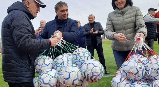 Фото пресс-службы правительства РК. Команды Симферопольского района получили мячи, комплекты футбольной формы, флажки, сетки для ворот и ворота. Об этом сообщила пресс-служба правительства РК. «В республике продолжается акция по обеспечению команд спортивной амуницией для проведения мероприятий в рамках Года сельского футбола «Новая футбольная форма каждой сельской команде». Вручение состоялось перед началом 16 тура Чемпионата Премьер лиги Крымского футбольного союза ФК «Крымтеплица» – и ФК «Таврия»», - рассказал зампредседателя Совета министров РК – министр сельского хозяйства РК Андрей Рюмшин. Он подчеркнул, что с каждым днем все больше фермеров принимают участие в данной акции. «Крымские аграрии тем самым показывают неравнодушное отношение к вопросу развития футбола в селах. В этот раз инициативу поддержали сельхозтоваропроизводители Симферопольского района. 8 сельским футбольным командам были вручены 100 мячей, комплекты формы и вся необходимая экипировка. Кроме того, 30 мячей были вручены и муниципальному бюджетному учреждению «Спортивная школа по футболу г Симферополь», - заявил вице-премьер.