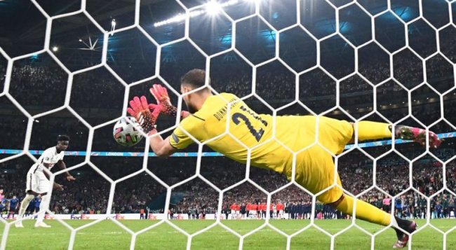 Вот он победный бросок в финале, сделавший Джанлуиджи Доннарумму, скромного голкипера «Милана», героем нации! Италия - Англия - 1:1 (0:1, 1:0, 0:0), по пенальти - 3:2. 11 июля. Стадион «Уэмбли», Лондон, 67173 зрителя. Судья Бьорн Кёйперс (Нидерланды). Голы забивали Леонардо Бонуччи (67 минута) - Люк Шоу (2). В серии пенальти голы забили Доменико Берарди, Леонардо Бонуччи, Федерико Бернардески - Гарри Кейн, Гарри Магуайр. Не забили пенальти Андреа Белотти, Жоржиньо - Маркус Рэшфорд, Джейдон Санчо, Букайо Сака. Итак, вечером в минувший понедельник родился шестнадцатый по счёту за шестьдесят лет чемпион Старого Света, как часто величают Европу, и им, по мнению девяноста процентов зрителей, должна была стать сборная Англии, которую вёл к победе 50-летний тренер Гарет Саутгейт. Хотя небольшая итальянская диаспора, проживающая в Британии, безраздельно отдавала преимущество «Скуадре адзурре», трёхкратному чемпиону мира, которая в далёком 1968 году становилась и чемпионом европейского континента. И вот уже 53 года не могла подтвердить свой высочайший класс. И вот теперь 56-летний наставник итальянцев Роберто Манчини смог возродить «Голубую команду». И как шутят острословы, это ему удалось сделать, лишь после того как футбольной мудрости ему удалось набраться в России, где сезон он порулил на берегах Невы санкт-петербургским «Зенитом». Уже в дебюте поединка хозяева поля англичане, а на «Уэмбли» они уже играли шестой поединок из семи проведённых матчей чемпионата, словно по нотам разыграли блестящую комбинацию, которую завершил часто подключающийся к атакам защитник Люк Шоу. По всему было видно, что итальянцам стоило огромных усилий удержаться на плаву при искромётных атаках англичан. Но они удержались! И по всей видимости, Манчини в перерыве нашёл нужные слова, на второй тайм южане вышли отмобилизованными до предела. Теперь они задавали тон, заставив продемонстрировать своё мастерство вратаря хозяев поля Джордана Пикфорда. Но за двадцать минут до конца основного времени и он не сумел спасти свою сборную от меткого удара ветерана итальянцев Леонардо Бонуччи - 1:1. И хотя Саутгейт обещал англичанам, что даже дети запомнят атакующую игру своих земляков в любую минуту финала, но на деле в добавочные полчаса он больше стремился сохранить ничейный счёт, рассчитывая, что серия послематчевых пенальти, по сути футбольная лотерея, улыбнётся его парням. Главными героями пришлось стать двум молодым вратарям - итальянцу Доннарумме, который вытащил свою сборную в финал в серии пенальти против испанцев, и англичанину Пикфорду. Оба они взяли по два пенальти, а бросок Джанлуиджи за мячом, который пробивал Букайо Сака, не только принёс вторую победу итальянцам спустя 53 года после первой в истории европейского футбола - 3:2, но стоил англичанам потери трёх миллионов евро. Ведь чемпион принёс в кассу своей национальной федерации футбола - 10 миллионов евро, серебряный призёр - 7, сборным, дошедшим до 1/2 финала, вручили по - 5, 1/4 финала - по 3,25, 1/8 финала - по 2, в групповых турнирах победа над соперниками оценивалась в 1,5 миллиона евро, а ничья - в 700 тысяч. Но, пожалуй, в истории футбола ещё никогда так высоко не оценивалось мастерство каждого участника решающей части Евро-2020, которые не испугались коронавируса, и за это получили каждый по 9,25 миллиона евро на зависть тем, кому нравится считат