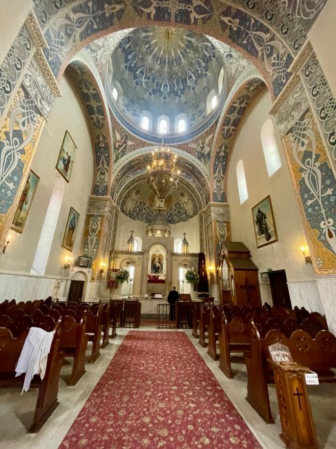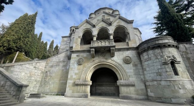 Храм расположен на возвышенности, но подниматься недолго. Фото автора. Храмовый комплекс Сурб Рипсиме в Ялте возводили 13 лет. Работы удалось закончить только в 1917 году, но до сих пор церковь выглядит великолепно. Можно назвать чудом, что она сохранила свой облик в период СССР. История церкви святой Рипсиме в Ялте - это пример того, как раньше люди были готовы тратить деньги не только на себя, но и на что-то доброе, вечное, что приносило бы радость другим людям. Название храм получил в честь дочери одного обеспеченного человека. Она скончалась в Ялте в 1901 году. Её отец решил таким образом на века сохранить память о любимом ребёнке. И ему это вполне удалось. При этом изначально планировалось, что храм будет построен в честь Святого Саркиса. Инициатором строительства стал бакинский нефтепромышленник Павел Гукасов или Погос Гукасян. Это был блестяще образованный человек, который учился в Московской практической коммерческой академии и Политехническом институте Дрездена. Долгое время он занимал пост председателя Совета съезда бакинских нефтепромышленников. В 1905 году переехал в Санкт-Петербург, где сделал стремительную карьеру. Человек был обеспеченный, при этом не жадный. Он нашёл возможность потратить существенную по тем временам сумму денег на то, чтобы в Ялте построили храм. «Отличительной чертой является его расположение на сложном рельефе местности. Раньше он возвышался над всей Ялтой, был виден со всех точек города, пока не началась советская застройка. Над проектом храма трудилась уникальная группа мастеров. Габриел Тер-Микелян - архитектор, который также спроектировал здание Азербайджанской филармонии, особняк Тагиевых, здание Тифлисского банка в Баку. Вардгес Суренянц - знаменитый армянский живописец, график. Он расписал внутреннее убранство храма, а именно его подкупольную часть. Остальную часть храма украсили уже в последнее десятилетие», сообщается в книге «Архитектура крымских армян». Внутри всё выглядит великолепно. Фото автора. Также в создании храма участвовал Сергей Меркуров - скульптор-монументалист, народный художник СССР. Он родился в Александрополе (ныне Гюмри) в 1881 году. Ему довелось выполнить резной декор его бело-мраморного святого престола. К слову, здесь же была создана семейная усыпальница. Похоронили тут не только дочь Рипсиме (её имя при крещении, в миру Валентина), но и других детей: сына Александра и младшую дочь Марагарит. Сейчас вокруг церкви разбит прекрасный парк. Вдоль парадной лестницы растут огромные кипарисы, весной и летом много цветущих растений. Внутри так же красиво, как и снаружи. Когда-то тут были установлены бронзовые двери, однако они бесследно исчезли в советский период. К слову, храм известен и по фильмам. Тут снимали различные эпизоды картин «Праздник святого Йоргена», «Мисс Менд», «Овод», «Три толстяка», «Щит и меч». Попасть сюда может любой желающий. Конечно, нужно одеться соответствующим образом. Ведь хоть церковь и невероятно красива, кажется, будто попадаешь в сказку, но религиозные каноны никто не отменял. Кроме того, армяне крестятся слева направо, что также важно. В выходной день, кстати, нам удалось попасть на службу. Она похожа на волшебство - священнослужитель будто поёт восхитительную песню о добре и любви.
