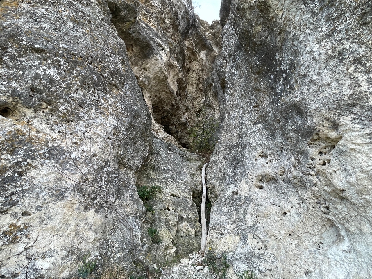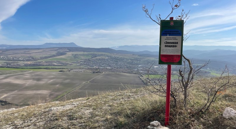 Сверху в пещеру не забраться, нужно найти крутую тропу слева от указателя (если стоять к нему лицом) и спуститься по ней. Фото автора. Крым богат на интересные места. Едешь по дороге, видишь холмы и горы, но не знаешь, что внутри них скрываются легенды, загадки, тайные тропы. Так можно сказать и о пещере Змеиной, расположенной на мысе Скифском, недалеко от посёлков Чистенькое и Левадки. Пещера Змеиная расположена в 10 км к югу от Симферополя, на Внутренней гряде, между долинами рек Альма и Западный Булганак. Она находится в мысе Скифском, обрывы которого достигают высоты 5-40 метров. Длина пещеры составляет 310 метров, а вход имеет высоту 11 и ширину 5 метров. Вход напоминает силуэт гриба, а внутри чётко выражены три этажа, хотя верхний почти не сохранился и его развалы лежат у входа. Для осмотра доступны средний и нижний уровни, соединённые вертикальными колодцами. Один из таких колодцев глубиной 3,5 метра ведёт на первый этаж, но спуск требует специального оборудования. Пространство пещеры состоит из извилистых проходов и просторных залов, причём осыпание перегородки объединило второй и третий этажи в одну большую галерею. Попасть сюда в целом непросто. Подниматься приходится буквально ползком. Маленьким детям и пожилым людям тут делать нечего. Но если вы молоды, гибки и спортивны, то заберётесь без особого труда. Спускаться, правда, чуть сложнее. А вот в самой пещере тоже скучать не придётся. Тут можно или ползти, или лавировать между выступами. Дорога не из самых простых. Свет проникает не далее 15 метров от входа, поэтому для осмотра необходим фонарь. Пещера сухая, в ней нет сталактитов и сталагмитов, но в одном из залов нижнего этажа сохранились кристаллы кальцита, свидетельствующие о прошлом наличии воды. С 1969 года пещера является геологическим памятником природы. Климат внутри пещеры отличается постоянством: температура здесь круглый год держится на одном уровне, около 10-12 °C, вне зависимости от времени года. В период Великой Отечественной войны эти подземные галереи служили партизанам временным надёжным укрытием. Многие проходы отличаются узостью и могут оказаться непроходимыми для людей крупного телосложения. Учёные предполагают, что некогда в пещере бил подземный источник, который со временем полностью исчез. Несмотря на многолетние исследования, в пещере остаются труднодоступные уголки, до сих пор не изученные до конца. Также в некоторых её участках можно встретить необычные глиняные отложения, имеющие выраженный красный оттенок. Подъём не для всех. Это нужно понимать. Фото автора. Как и многие другие подземные полости Крыма, Змеиную пещеру облюбовала колония летучих мышей, главным образом подковоносов. Эти млекопитающие прекрасно приспособлены к существованию в полной темноте и используют пещеру как безопасное убежище для зимней спячки и выращивания детёнышей. Кроме рукокрылых, в пещере встречаются различные виды беспозвоночных, приспособившиеся к жизни под землёй. Среди них - пещерные пауки, насекомые и прочие мелкие существа, которые, как правило, абсолютно безобидны для людей. Из-за почти полного отсутствия света растительный мир внутри пещеры не развит. Лишь у самого входа, куда проникают солнечные лучи, можно заметить скромные поселения мхов и лишайников. Это место также представляет большую археологическую ценн