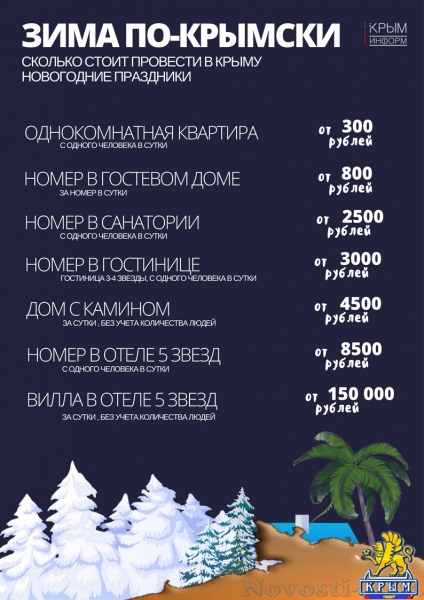 В преддверии Нового года чиновники, различные ассоциации, агентства и порталы, связанные с туристической отраслью, традиционно начинают делать прогнозы и подбивать статистику поисковых запросов и броней на отели и авиаперелеты. При этом во внутренних потоках лидирующие позиции занимает Крым. Крыминформ выяснил, что ждет россиян и других гостей полуострова на новогодних каникулах – 2018. Непрограммная тенденция Многие крымские отели не стали устраивать на эти новогодние каникулы каких-то особых акций с «пакетом услуг» и минимальным количеством дней пребывания гостя. Просто оставили на этот период цены 2017 года, что обычно делают санатории. «Чем Крым хорош, что предложения есть на любой вкус: от элитного отдыха до очень реальных предложений и по номерному фонду, и по банкетному меню. И в этом году наши отельеры не обязывают покупать «пакетами» услуги. На сутки? Пожалуйста, заезжайте на сутки. В этом году многие отели поменяли свои маркетинговые инструменты», – подтверждает наши наблюдения исполнительный директор в ассоциации «Туристический альянс Крыма» Светлана Возная. Лидером по элитным предложениям, естественно, является Южный берег Крыма, а именно: два местных пятизвездочных отеля – «Крымский бриз» и «Мрия». Максимальная ценовая отметка здесь достигает 150-250 тысяч рублей в сутки. Правда, речь идет о целой вилле. Самый скромный вариант в одном из этих отелей стартует с 8 400 рублей. Для любителей самоорганизованного досуга в Ялте есть множество предложений в частном секторе от 300 рублей в сутки с человека в скромной квартирке и до 800-1500 за номер с удобствами в небольших гостевых домах. Санаторный пансион Особняком в «новогоднем меню» стоят санатории. К примеру, пять суток в санатории «Руссия» в Ялте в одноместном стандартном номере с полным пансионом и минимальным набором оздоровительных услуг обойдется в 17,5 тысячи рублей. Вообще, при относительно равных условиях, средняя суточная цена в крымских здравницах с полным пансионом составляет 2,5-3,5 тысячи рублей в сутки. Конечно, речь в большинстве случаев идет про облагороженный «советский» уют, а отнюдь не трех- или четырехзвездочных SPA-центрах. Зато многие санатории могут предложить к услугам отдыхающих большие крытые бассейны и красивые парки. К слову, воспользоваться банными услугами и поплавать в бассейне в южнобережных городах, в частности, в Ялте можно, даже если вы не остановились в отеле или санатории, где он расположен. Цена за «поплескаться» в зависимости от времени суток, дня недели и набора допуслуг варьируется от 200 до 1000 рублей за персону. Ценовые предложения в других городах не сильно отличаются друг от друга. Везде можно подыскать как отель уровня три-четыре звезды, который в качестве допуслуг предложит два вида бань (сухая и хаммам) и массаж, что позиционируется как SPA-комплекс (от 3 до 15 тысяч рублей в сутки за номер с завтраком), так и уютные номера с удобствами в гостевых домах или квартиры, которые сдаются посуточно (от 800 рублей до 1,5 тысячи в сутки). Некоторые частники сдают в распоряжение туристов целые дома. Например, в Евпатории можно снять на пять дней дом с отдельным двориком и двумя спальнями за 6 тысяч рублей. Ровно такое же предложение мы нашли и в Феодосии. А в Севастополе цена оказалась еще скромнее: 4,5 тысячи рублей, да еще и камин обещают. Активность д