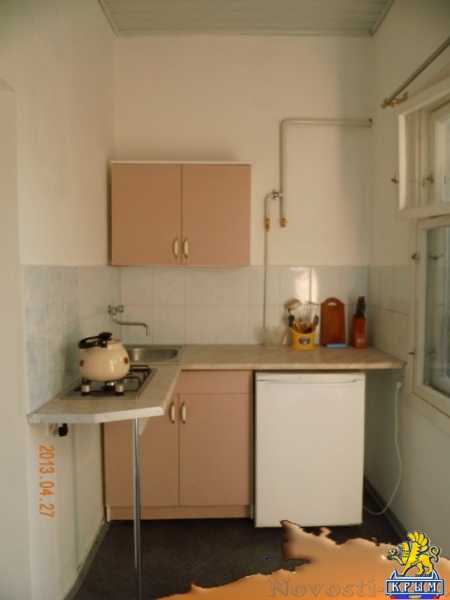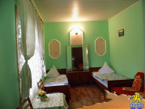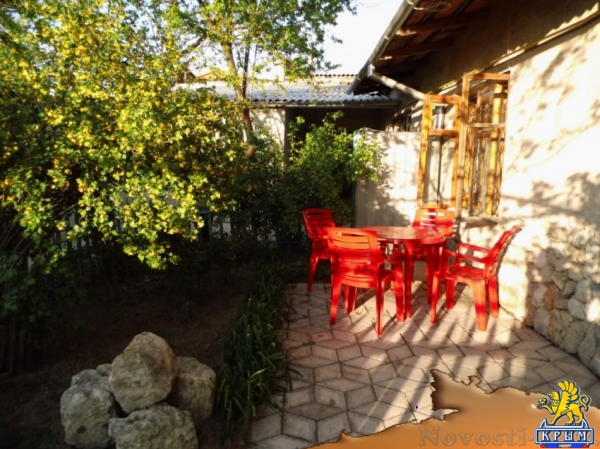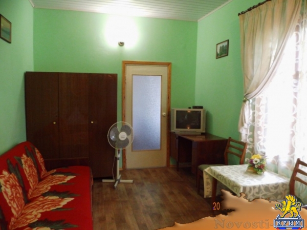 Однокомнатный капитальный, каменный домик из крымского ракушечника находиться в тени деревьев и не требует кондиционера. В домике 3 кровати (2 односпальные и 1 раскладной диван), шкаф, стол, трельяж, комод, телевизор, вентилятор. Кухня, совмещённый душ, туалет, горячая и холодная вода круглосуточно.