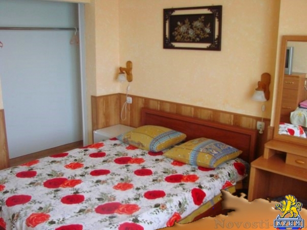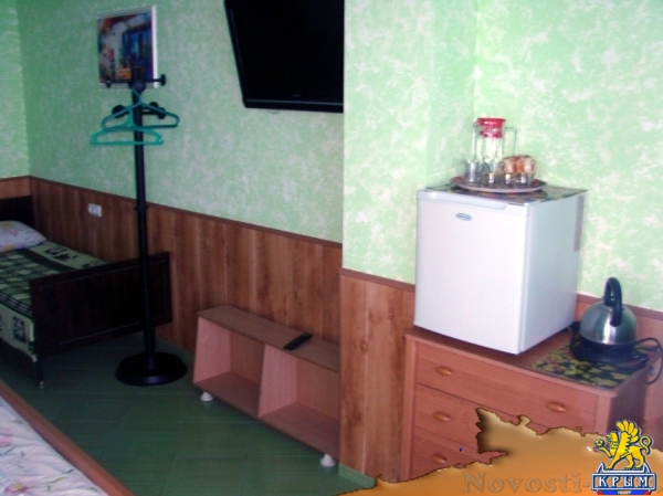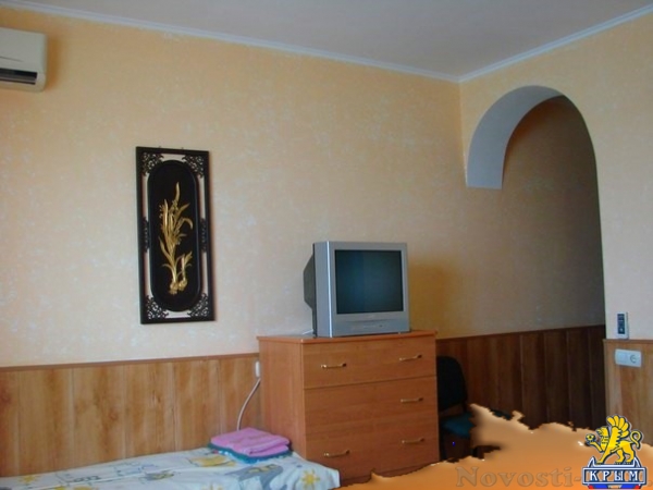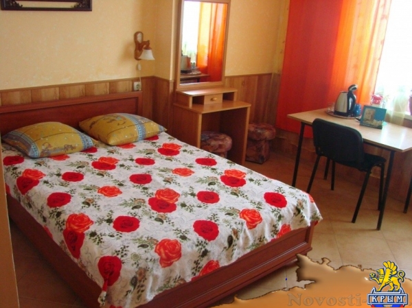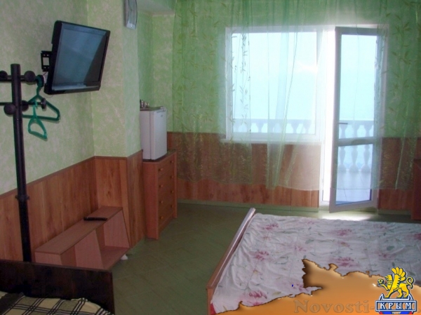 Двухкомнатный номер люкс площадью 70 м2. В нем может разместиться 4-5 человек. В люксе все удобства - душ, туалет, холодильник, два телевизора, кондиционер, своя мини-кухня, электрический чайник, фен в ванной комнате, бесплатный доступ к беспроводному интернету вай-фай. Двухкомнатный люкс имеет большой балкон с видом на море и пляж Качи со столиками и креслами для отдыха наших гостей.