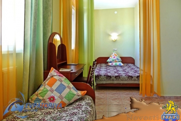 Цены указаны за человека в сутки Январь: 500 руб Февраль: 500 руб Март: 500 руб Апрель: 500 руб Май: 500 руб Июнь: 800 руб Июль: 950 руб Август: 1000 руб Сентябрь: 800 руб Октябрь: 500 руб Ноябрь: 500 руб Декабрь: 500 руб Общая информация о номерах Номера рассчитаны на проживание 2-5 человек, во всех номерах санузел и душевая,кондиционер, ТВ,холодильник, доступ в интернет.Двуспальные, односпальные кровати, шкаф купе, прикроватные тумбочки,стол-трюмо,стулья.В отделке номеров использовались экологические материалы. Удобства и услуги Горячая вода | Телевизор | Интернет | Парковка | Кондиционер | Холодильник | Стиральная машина | Сауна | Мангал | Полотенце | Утюг | Сейф | прачечная | трансфер | пляжный инвентарь | библиотека | аптечка | вызов врача | вызов такси | покупка и доставка товаров первой необходимости | аренда детских колясок и кроватокСанузел в каждом номере душ, санузел Питание Завтрак входит в стоимость проживания, обед и ужин по желанию(комплексное и заказное меню, детское и диетическое питание,своя выпечка) Автостоянка бесплатно перед гостиницейЧто есть на территорииПлощадка для приема пищи на свежем воздухе и занятий с аниматором, фонтан, мангалВид из окон на поселок Условия для детей аниматор бесплатно с 19 до 21 , детский видеоканал Отдых с животными по согласованиюПлощадь (территория): 7,78Всего номеров: 29Всего этажей: 3Расстояние до: моря: 350 м магазина: 250 м базара: 350 м аптеки: 400 м автостанции: 450 м центра: 450 м районного центра: 20 км Расположение и инфраструктураКафе,рынок,аптека,медучереждение,автостанция,церковь РПЦ Пляж пляж песчаный, муниципальный Цены на услуги Завтрак включен в стоимость проживания,обед и ужин по желанию, трансфер по предварительной заявке( автомобили технически исправные, с адекватным водителем, с кондиционером, имеются детские кресла),доступ в интернет- бесплатно,хранение документов в сейфе,услуги прачечной,библиотека,вечером занятие с аниматором( с 15.06 по 20.08)бесплатно,организация экскурсий, вызов врача,доставка товаров первой необходимости(детское питание, памперсы и тп) аренда детских колясок и кроваток Услуги, включенные в стоимость завтрак( с мая по сентябрь) | уборка номера | смена постельного белья и полотенец | доступ в интернет Услуги за дополнительную плату обед и ужин | трансфер | сейф | услуги прачечной | аренда детской кроватки и коляски | сауна | настольный теннис | мангалСкидкиДети до 3 лет проживаю бесплатно, дети до 10 лет -скидка 30%Возможна оплата картойУсловия и ограничениявозможен отдых с домашними животными животными по согласованию Условия бронирования бронирование через почту гостиницы more-izumrud@rambler.ru Оплата на расчетный счет или банковскую карту.Предоставляем документы по затратам на отдых для компенсации в бухгалтерию работодателя Трансфер платно, по заявкеКак добратьсяОт Симферополя до Евпатории(автобус, такси) , от Евпатории до поселка Штормовое(автобус, такси)Сменить Галерею