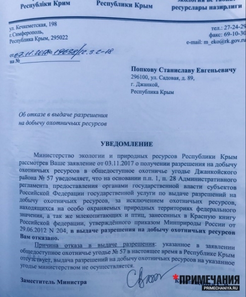 Но, как нам сообщили охотники, в Министерстве экологии и природных ресурсов Крыма о нарушении знают. Все документы по Джанкойскому и Нижнегорскому районам подписывает только Компанейцев — подписи министра Геннадия Нараева нет.