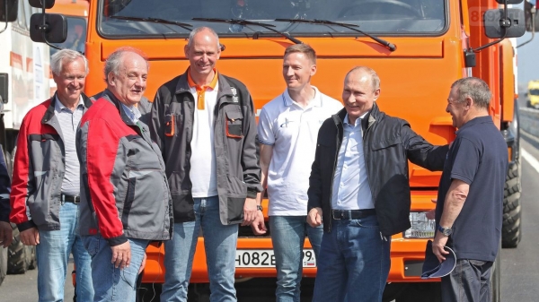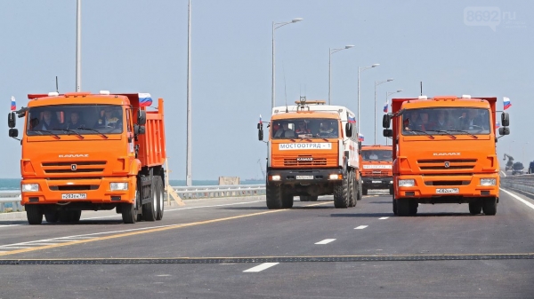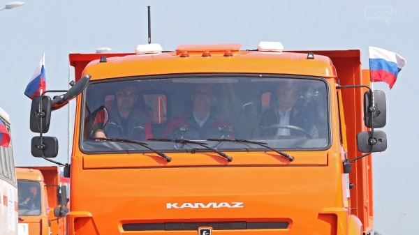 Напомним, что вчера 15 мая состоялось официальное открытие автодорожной части Крымского моста. Первой из Краснодарского края в Крым проехала колонна из 35 грузовиков. Колонну возглавил КамАЗ, которым управлял президент России Владимир Путин. Автомобили преодолели 19-километровый транспортный переход с одного берега Керченского пролива на другой за 21 минуту.