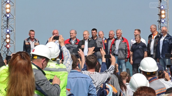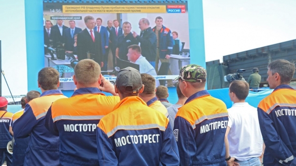 На другом конце 19-километрового моста, в Крыму, Путин принял участие в митинге-концерте по случаю открытия первой очереди транспортного перехода.
