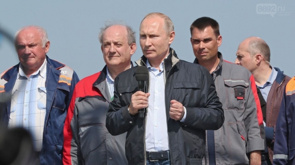 «Искренне поздравляю вас с этим замечательным, в полном смысле этого слова, историческим днём. Историческим, потому что в разные исторические эпохи, ещё при царе, люди мечтали о том, чтобы построить этот мост. Потом вернулись к этой идее в 30-е, 40-е, 50-е годы прошлого столетия. Наконец, благодаря вашему труду и таланту этот проект, это чудо свершилось», — сказал Путин.