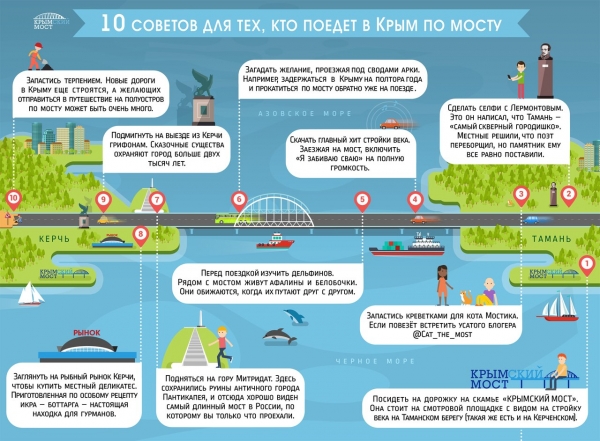 Keat 19-май, 01:02 193 СевастопольИнфоцентр "Крымский мост" подготовил 10 советов туристам, которые поедут на полуостров по мосту после его открытия.
